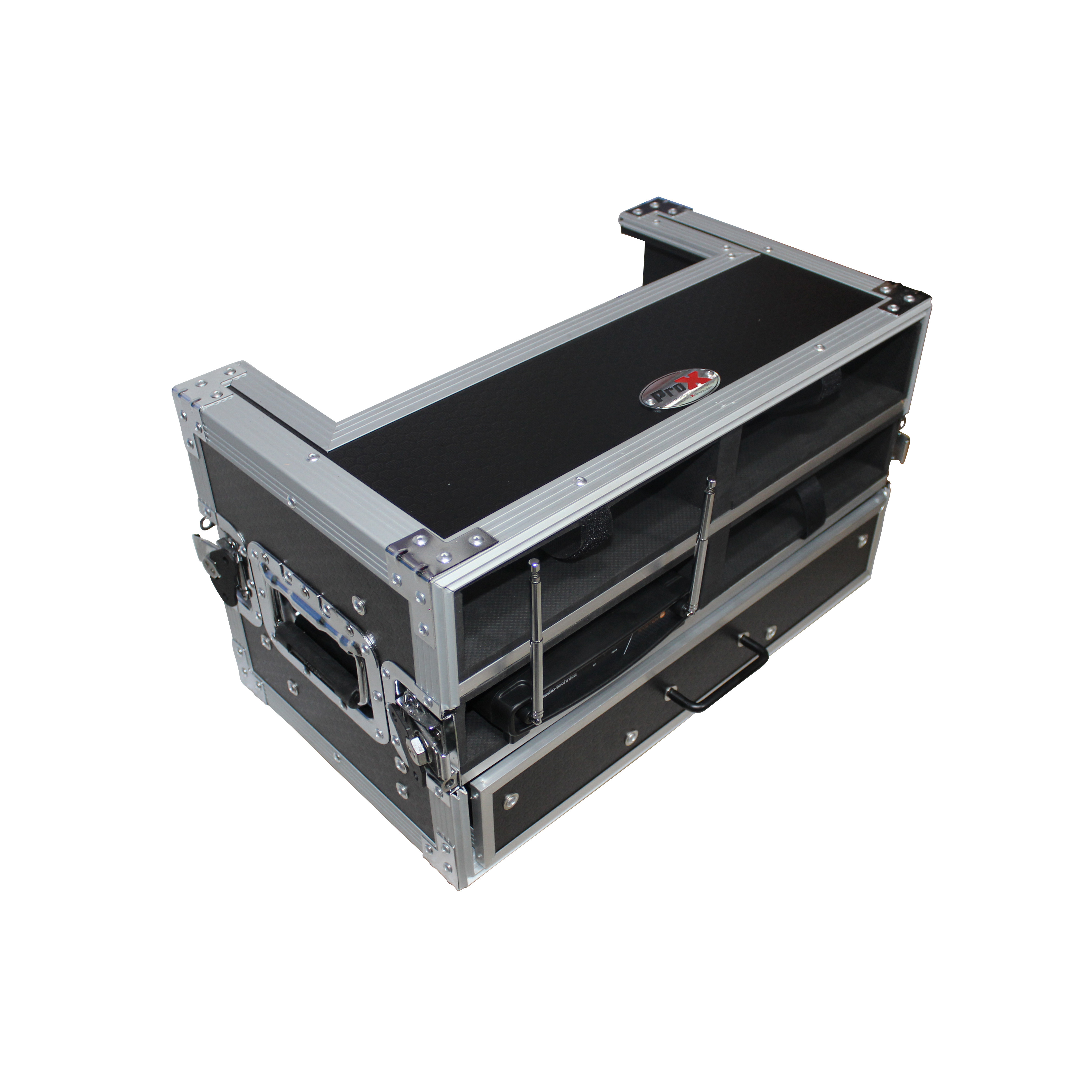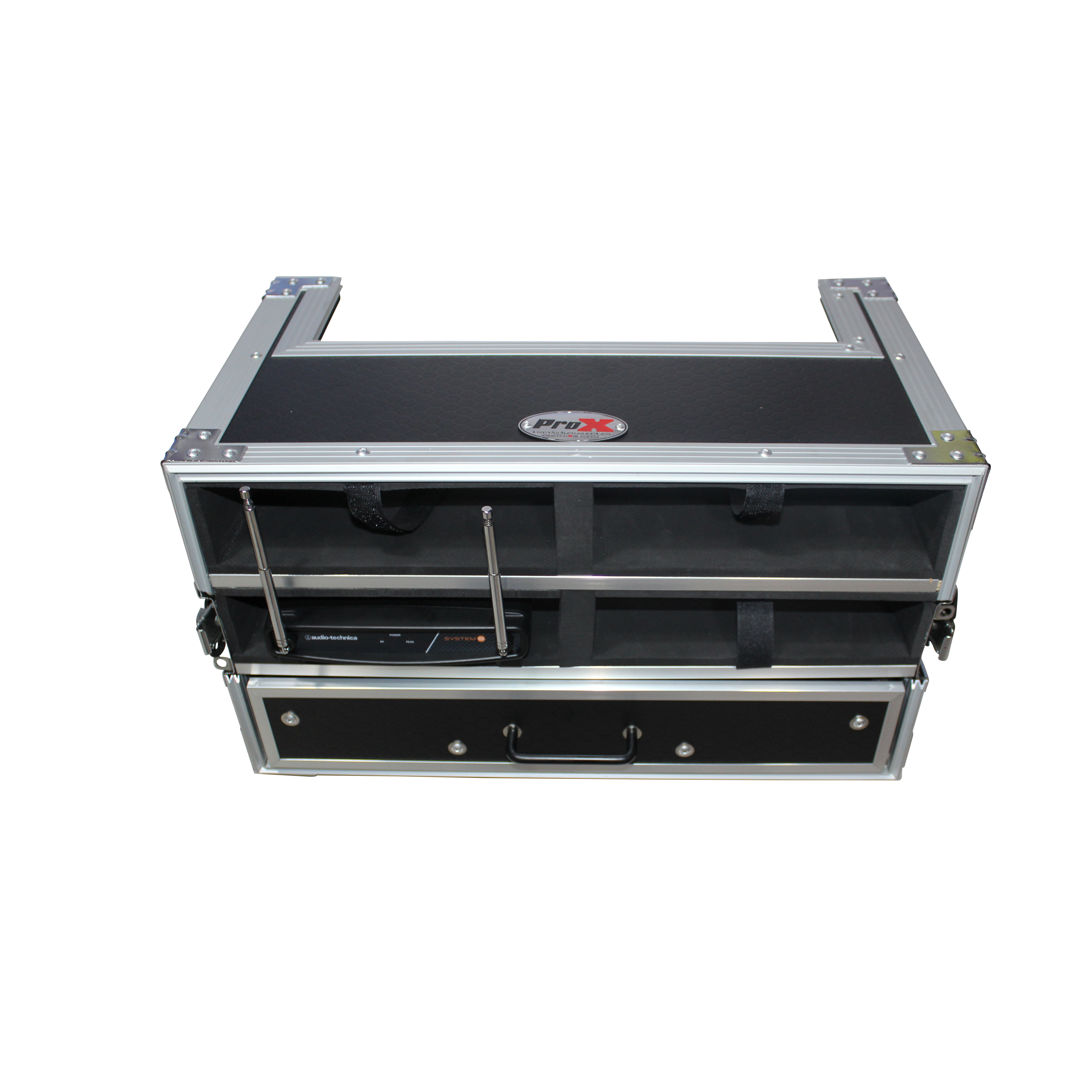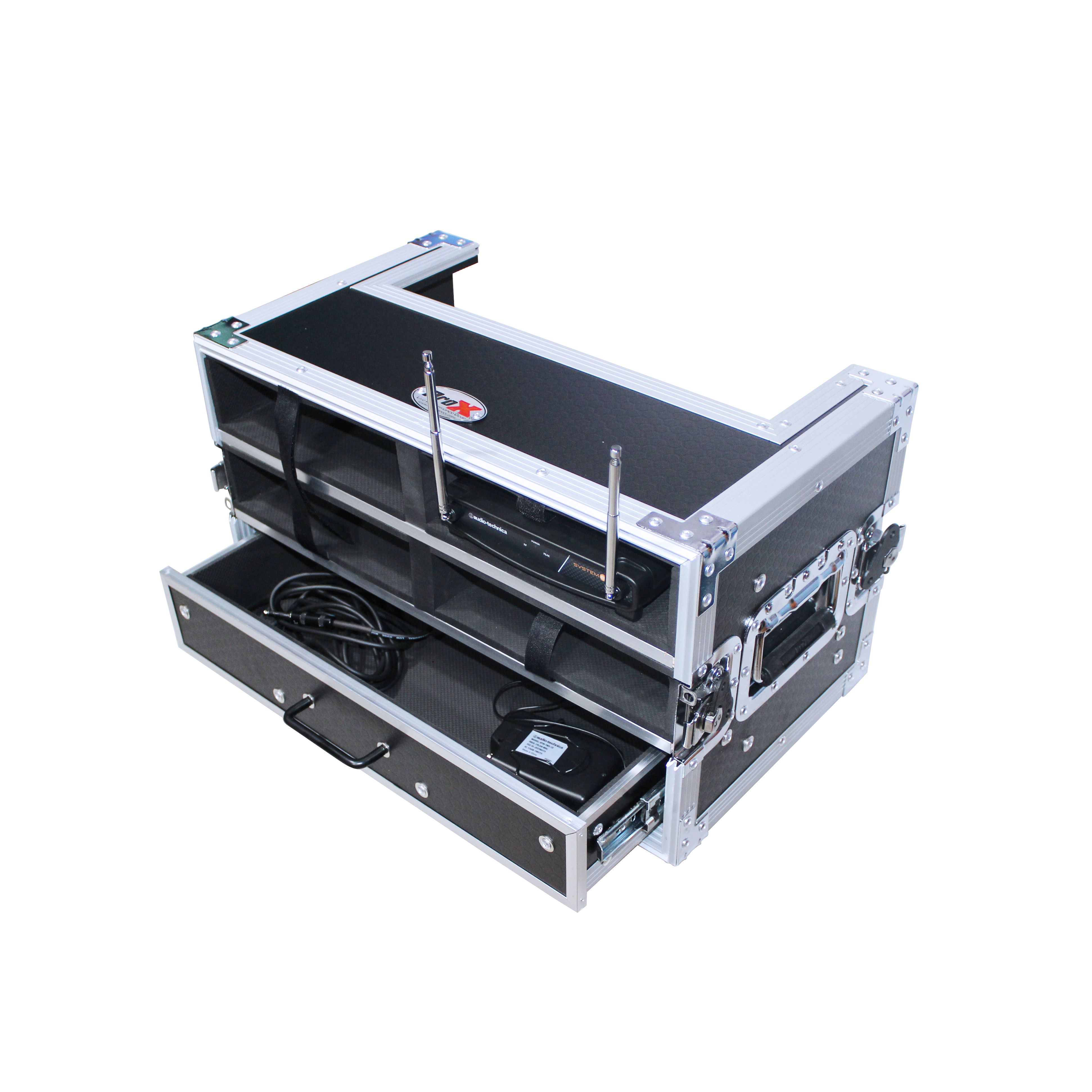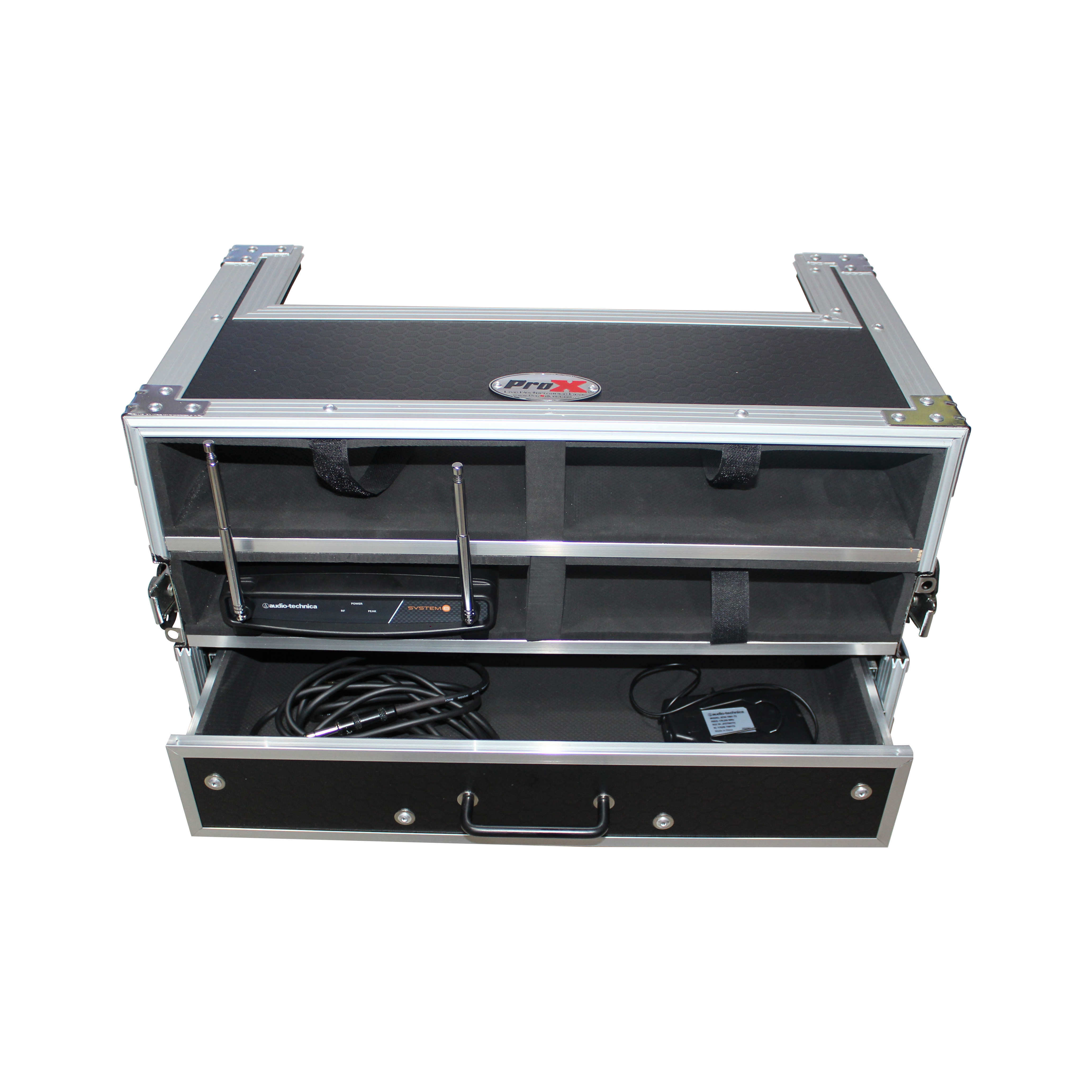 Looking for superior protection and ease of use for your wireless microphone systems? Look no further than The ProX X-4WM2DR Wireless Microphone Case. This case features a 4 base unit capacity as well as 8 handhelds stored in both covers with 1X: 2 SPACE (2U) drawer for tools and cable.