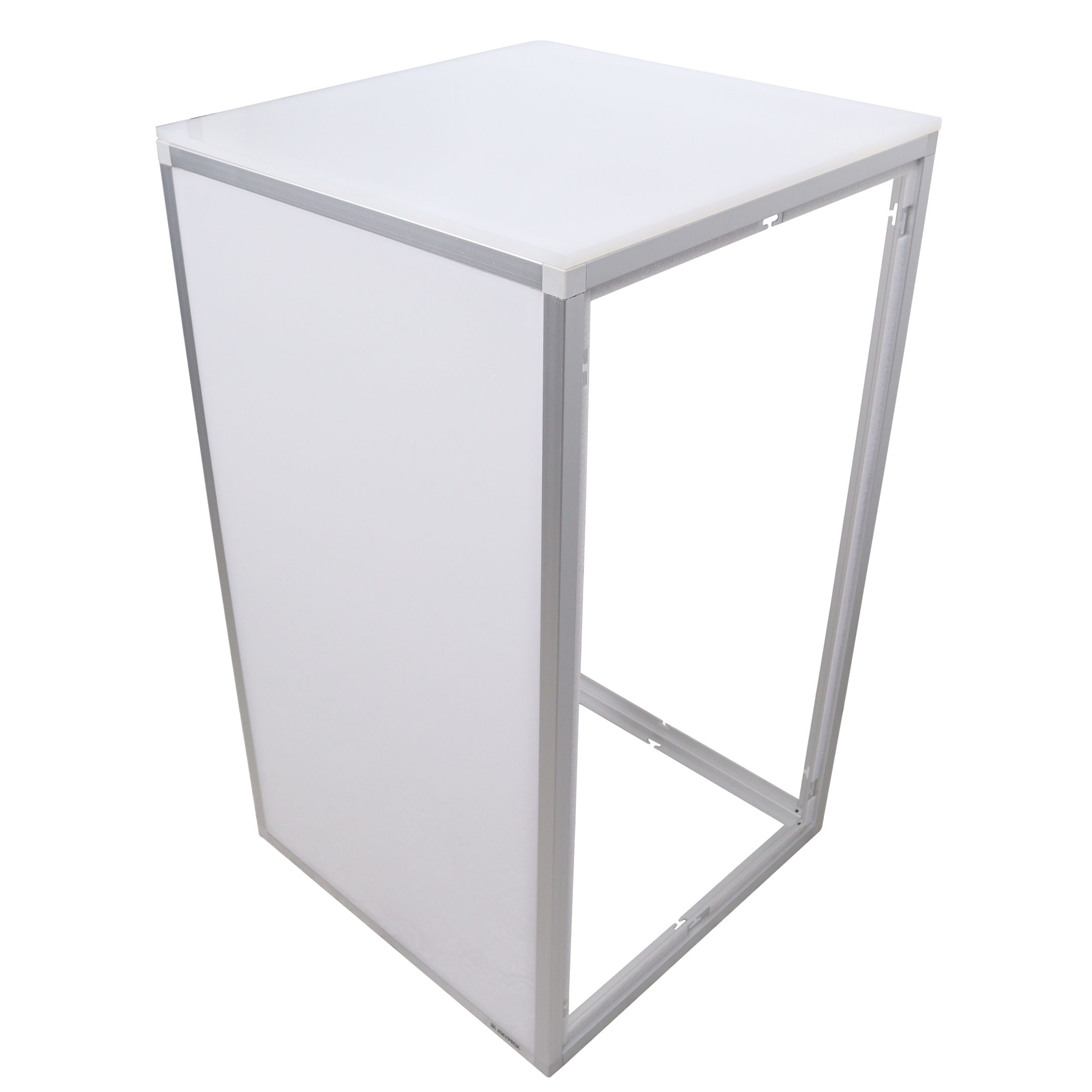 These cubed platforms stand out when an LED lighting fixture, strip tape, or the X-LUMOTREE is placed inside the center of the unit. Each unit includes a pre-cut hole in the side panel to route power cables in and out. Multiple platforms can be stacked or arranged to create a variety of display configurations.