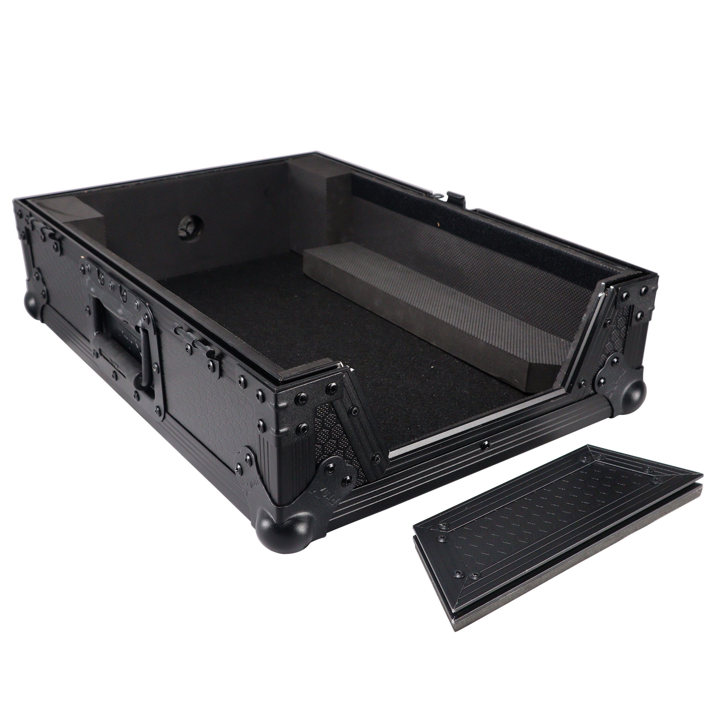 This large-format cd player case is constructed with our ATA style 300 GigReady Signature Series laminated 3/8" re-enforced plywood for complete protection of your investment. Our cases are standard with steel, heavy-duty ball corners to withstand the rigorous travel that pro-DJ demands. Black on Black construction and modern design will turn heads and keep with the decor of any venue.