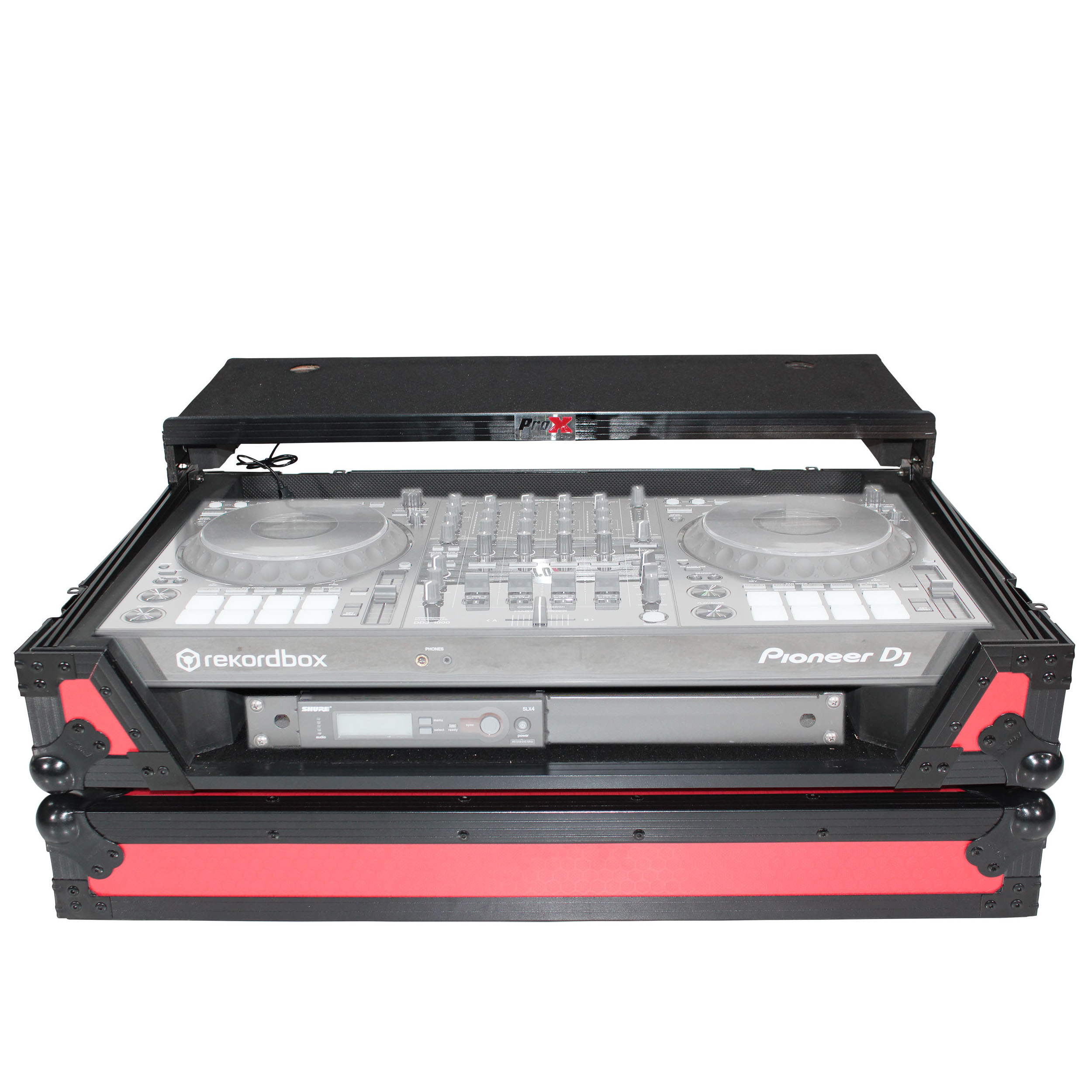 The XS-DDJ1000 WLT RB mk2 RED ON BLACK ATA-style flight case with sliding Laptop Shelf is constructed with our rugged signature 3/8" Gig-Ready Series Plywood, durable rubber wheels, reinforced steel ball corners, as well as recessed steel padded handles and latches. There is additional space for cables and small accessories in the back and underneath the unit for convenience, as well as a removable front panel for you to access front input jacks easily. The front removable panel allows for easy access to the front controls and headphone/mic jacks. Includes a 1U space below the controller.