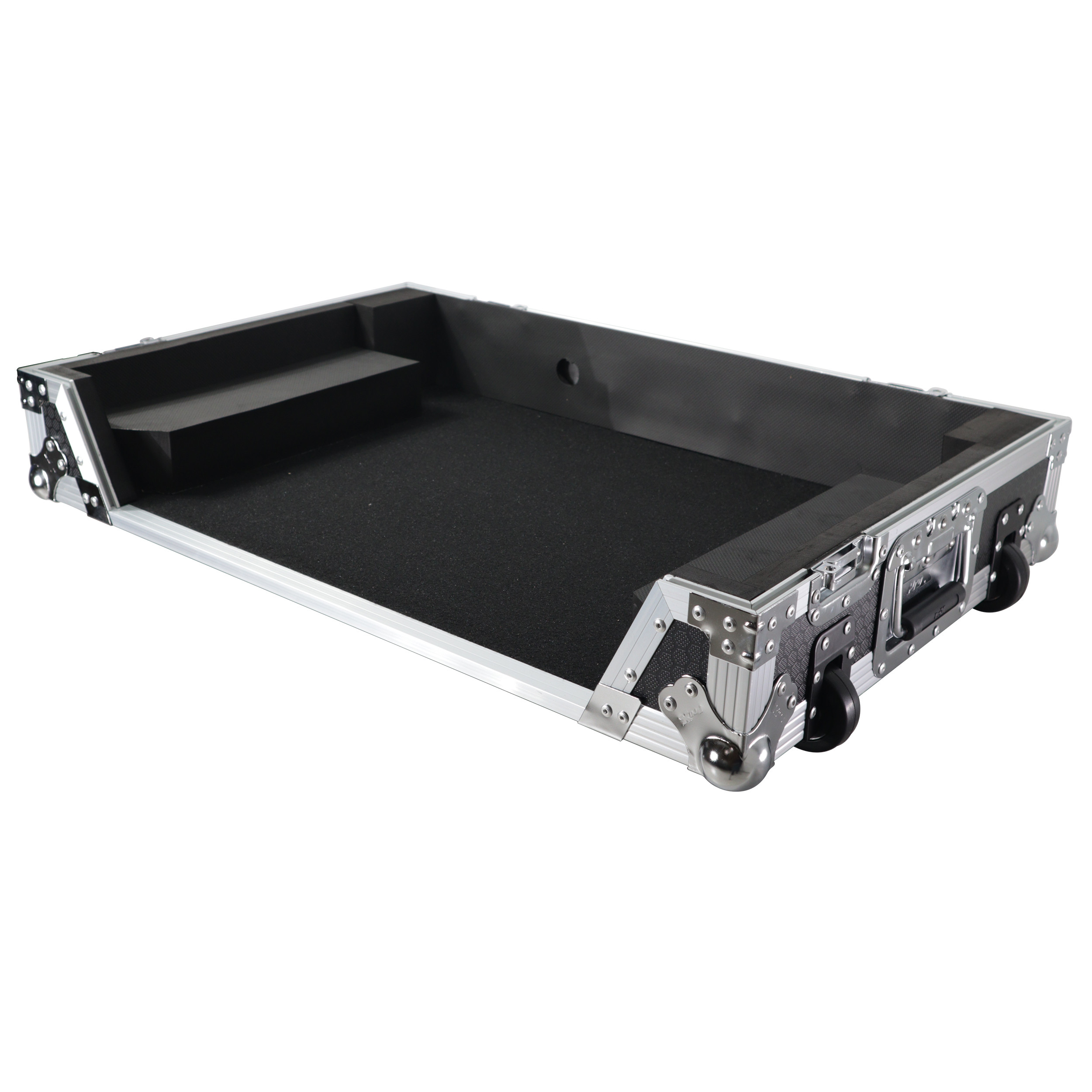 The ProX XS-DDJ-REV7 is constructed with our rugged signature 3/8" Gig-Ready Series Plywood, reinforced steel ball corners, and recessed steel padded handles and latches. There is additional space for cables and small accessories in the back and underneath the unit for convenience, and a 1U Rack Space underneath the unit (1U Rail Hardware Included), as well as a removable front panel. The front removable panel allows for easy access to the 1U rack space, front controls, and headphone/mic jacks.