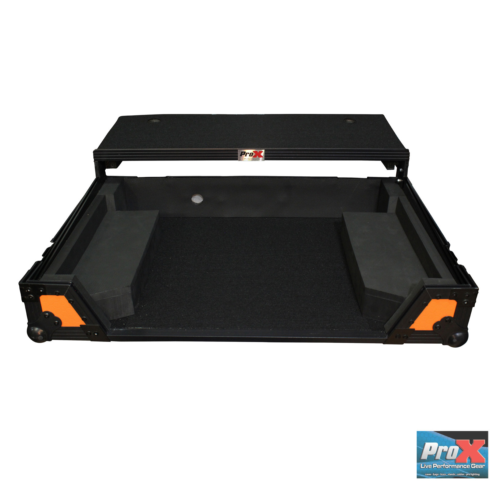 The XS-DDJSXWLTOB ORANGE ON BLACK case is constructed with our rugged signature 3/8" Gig-Ready Series Plywood with laptop shelf, durable rubber wheels, reinforced steel ball corners. There is additional space for cables and small accessories in the back and underneath the unit for convenience, as well as a removable front panel for you to access front input jacks easily; allowing easy access to the front controls and headphone/mic jack.