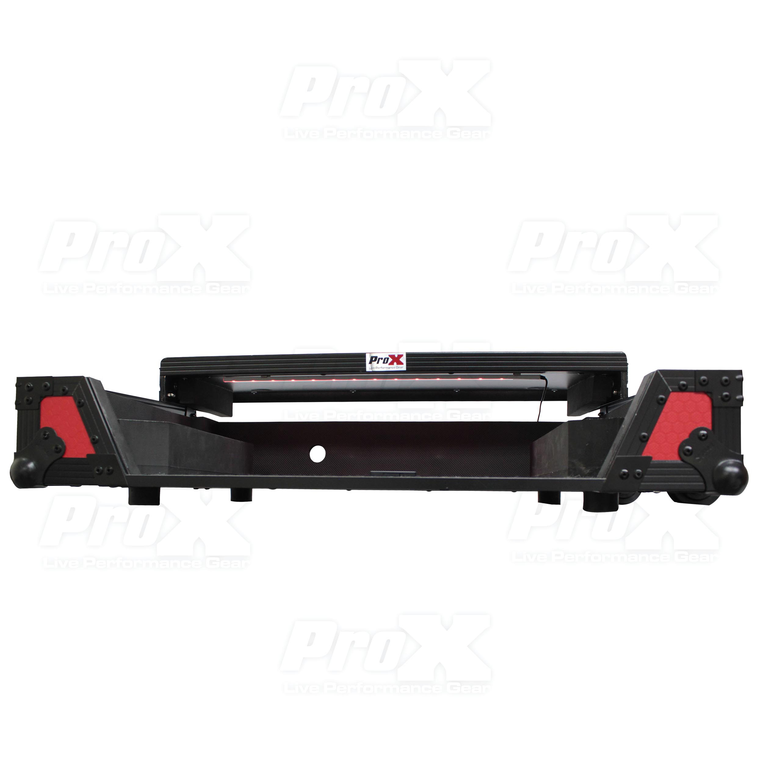 The XS-DDJSXWLTRB RED ON BLACK case is constructed with our rugged signature 3/8" Gig-Ready Series Plywood with laptop shelf, durable rubber wheels, reinforced steel ball corners. There is additional space for cables and small accessories in the back and underneath the unit for convenience, as well as a removable front panel for you to access front input jacks easily; allowing easy access to the front controls and headphone/mic jack.