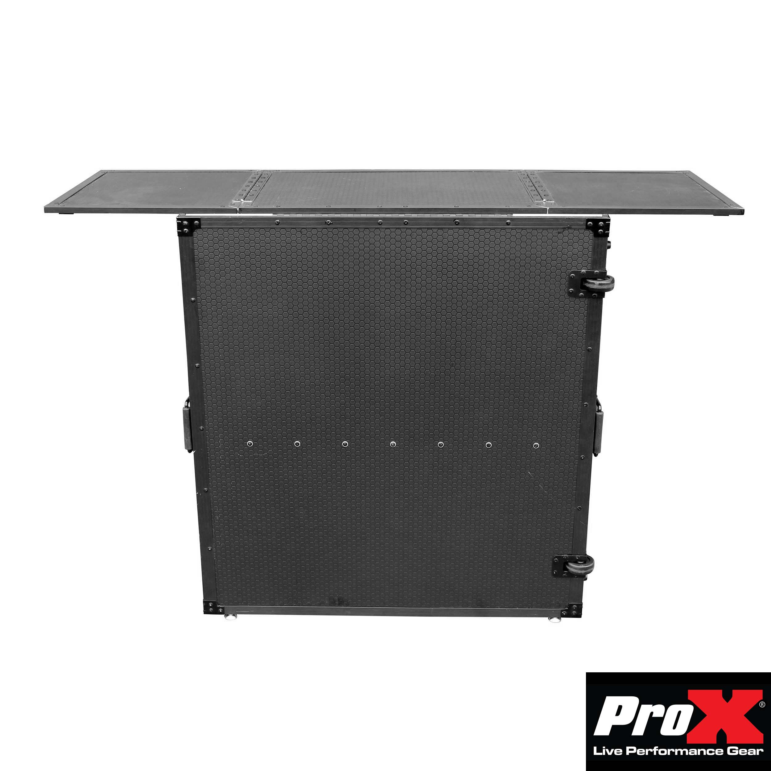 Additionally, it has a utility shelf under the table that can be used for backup controllers or laptops, extra cables, etc. The ProX DJ table is constructed with our signature Sleek Honeycomb Digital plywood design finished in a black laminate, and aluminum accents with a black powder-coated finish it's sure to make a good impression at your event. This unit is also equipped with wheels that ease your transportation experience.