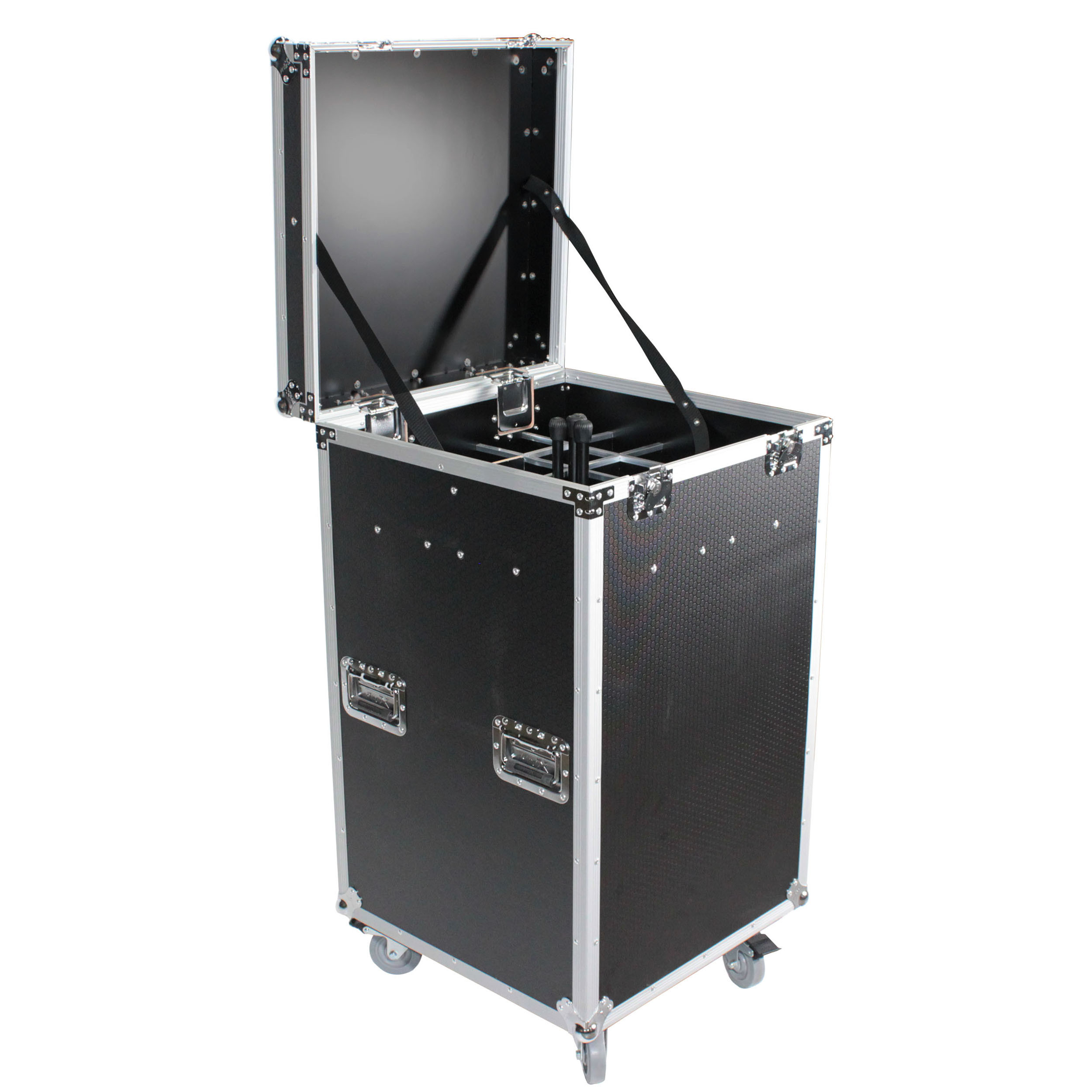The ProX XS-MIC25STN Microphone Stand Case holds up to 25 folding microphone stands. It has Four 4" Heavy Duty Casters (2 locking) to make moving & loading easier and the latching hinged lid makes loading and unloading a breeze.