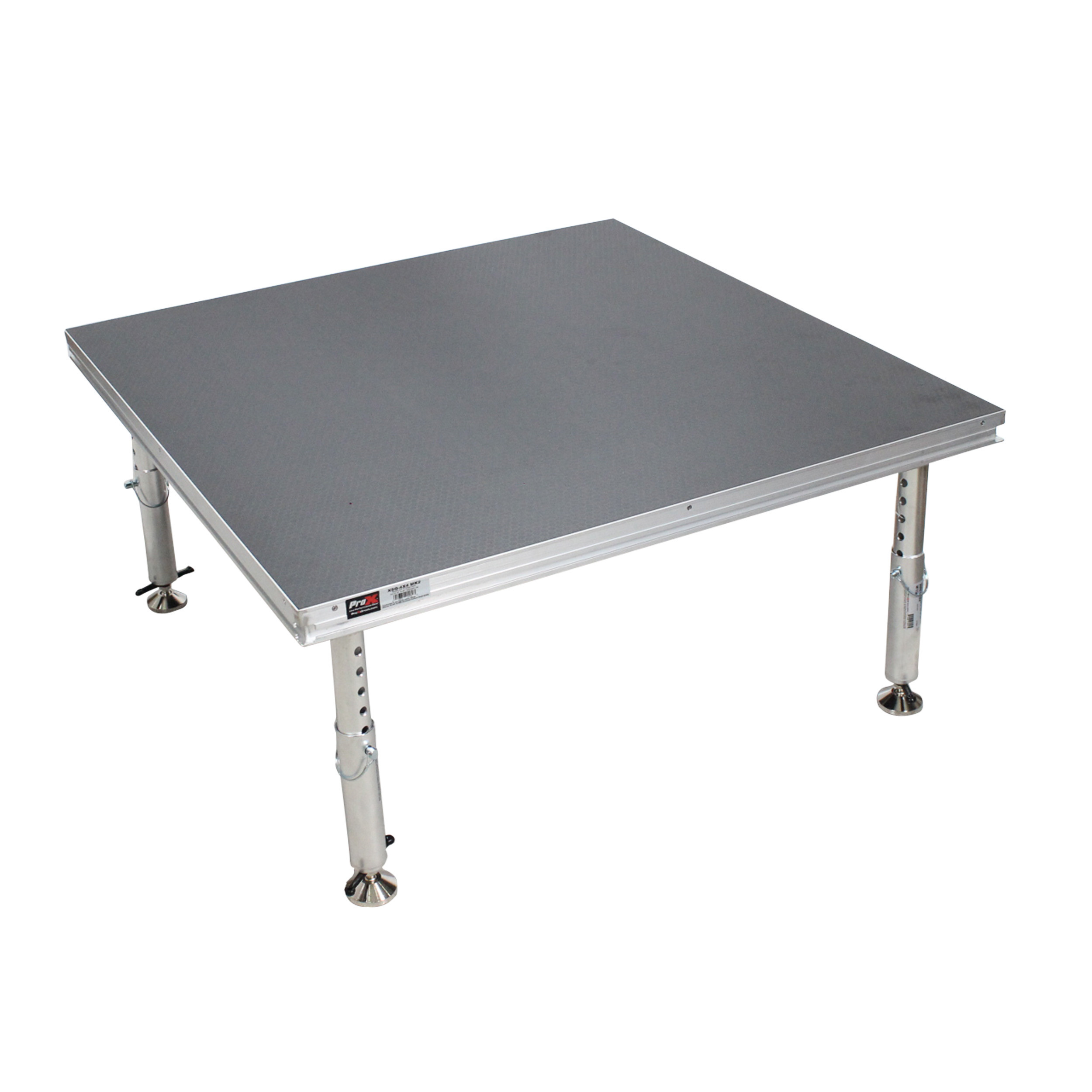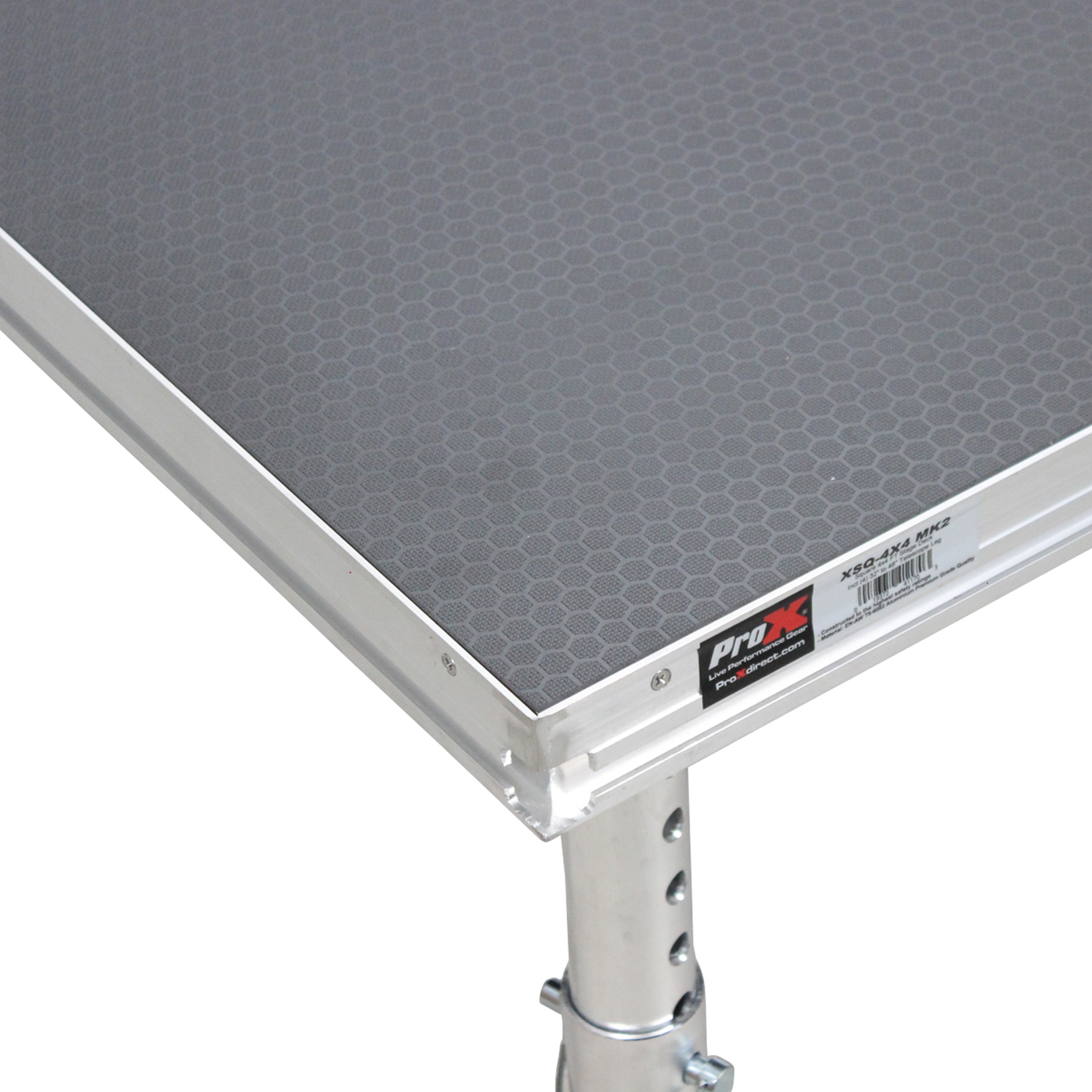 ProX XSQ-4X4 4' x 4' StageQ Single Stage Unit Height Adjustable from 28 to 48" in. This ProX StageQ Stage unit is a convenient and portable staging solution that is built for long-lasting use and durability. These Stages are designed to minimize setup times and give you the ability to transport and set up in minutes. Each unit comes with four height-adjustable Telescoping legs that raise the stage's height from 28-inch to 48-inch with totally stabilized functionality.