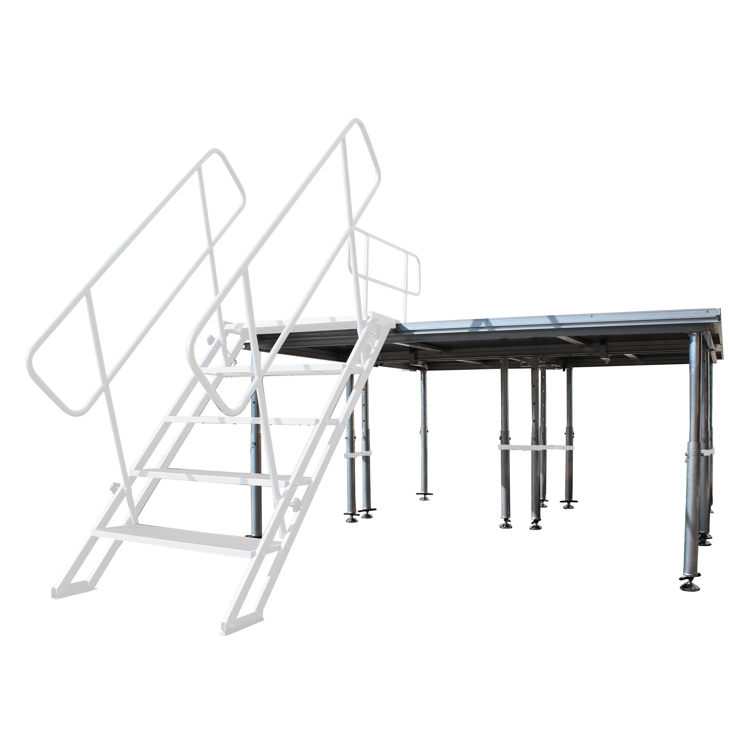 Each stage has our Signature Honeycomb Digital top laminate which has a rugged hexagonal pattern that creates foot grip and traction. They are meant for outdoor and indoor applications. The included telescoping legs adjust from 28-48" which is set by a locking pin. Each leg has a ball joint above the rubber feet that can be adjusted in height to adjust to precision for the ground level.
