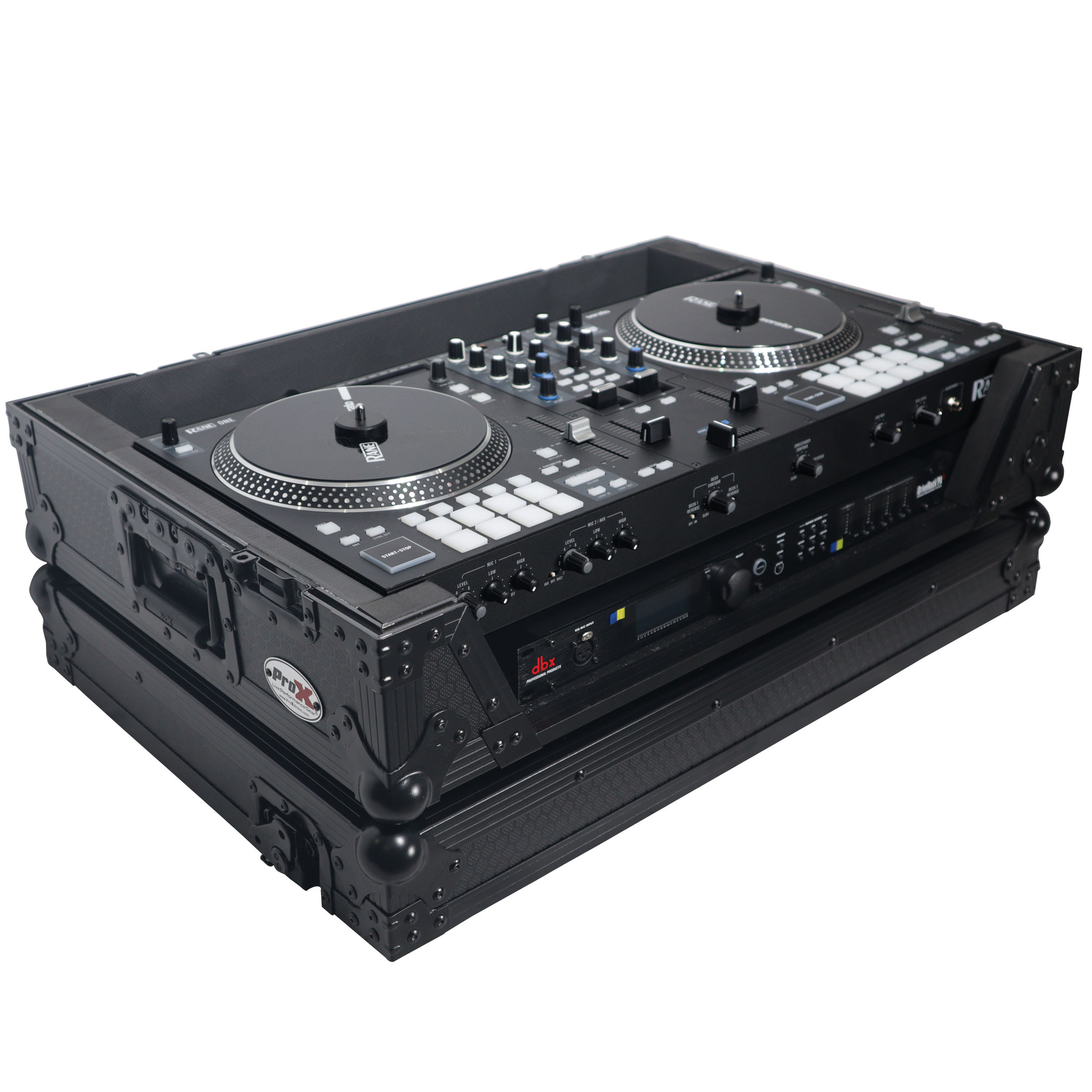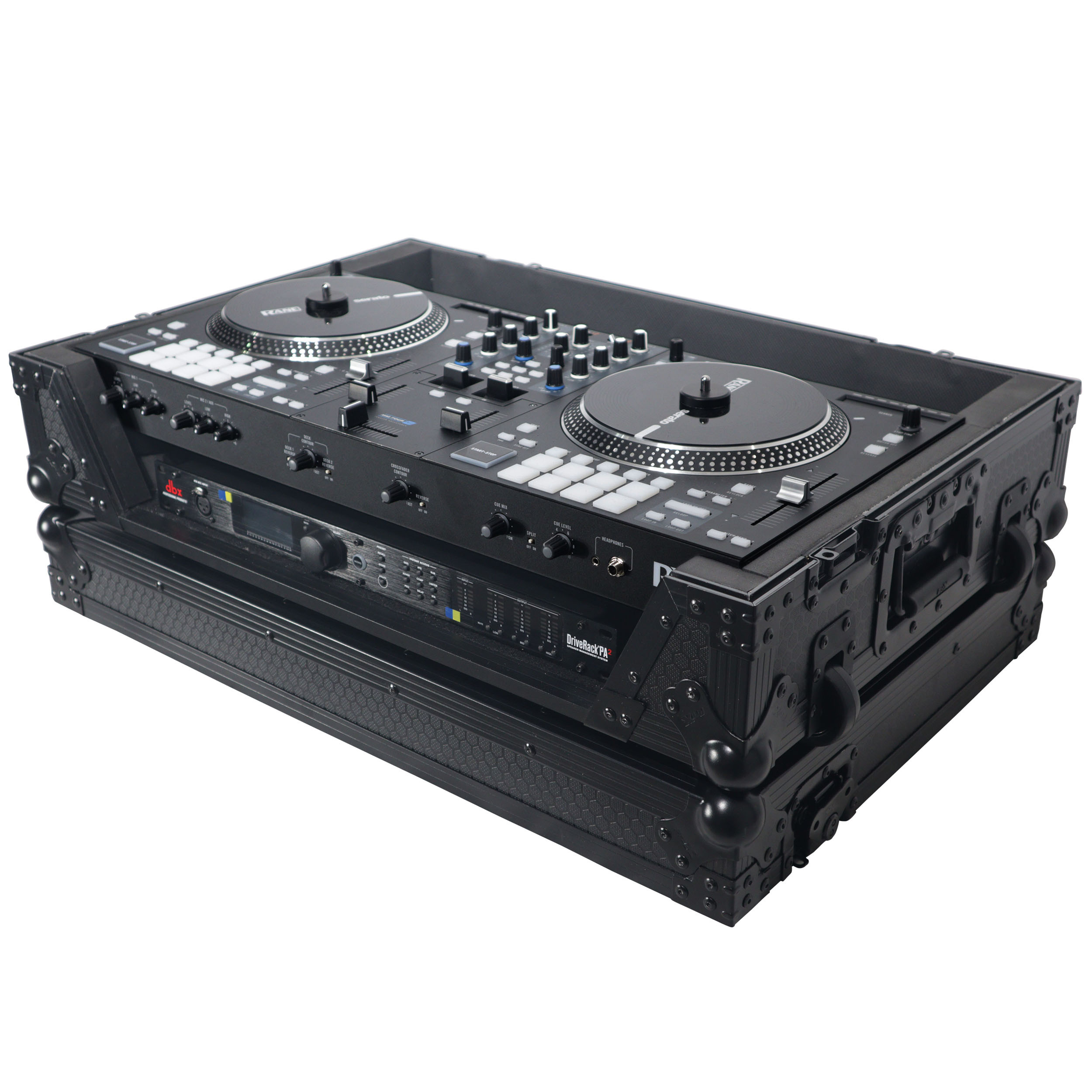 The ProX XS-RANEONE WBL black on black flight case is constructed with our rugged signature 3/8" Gig-Ready Series Plywood, durable rubber wheels, reinforced steel ball corners, as well as recessed steel padded handles and latches. There is additional space for cables and small accessories in the back and underneath the unit for convenience, and a 1U Rack Space underneath the unit (1U Rail Hardware Included), as well as a removable front panel. The front removable panel allows for easy access to the 1U rack space, front controls, and headphone/mic jacks.