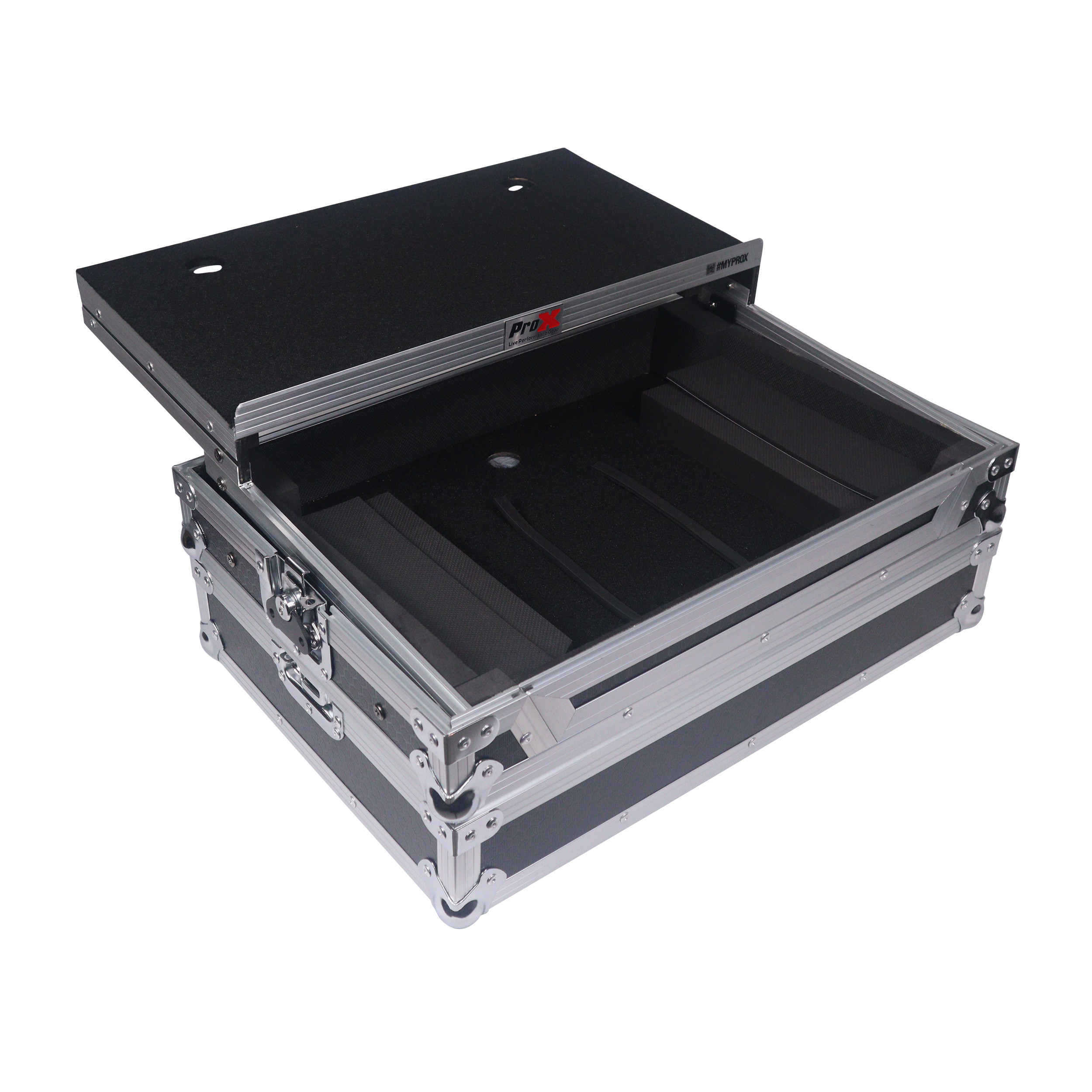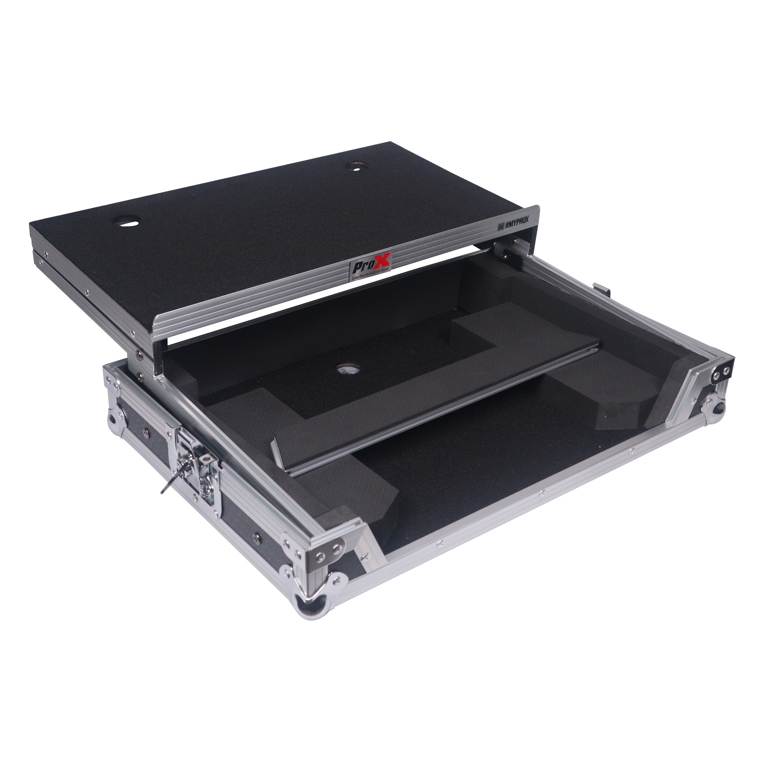 Gig-Ready' SeriesProX Gig-Ready' Series cases are constructed from rugged 3/8" Plywood, reinforced with steel ball corners, spring-loaded recessed padded handles, and twist-locking latches. There is additional space for cables and small accessories at the rear underneath the controller for convenience. The removable front panel allows for easy access to the DJ controller front control knobs, headphones, mic jacks, etc.
