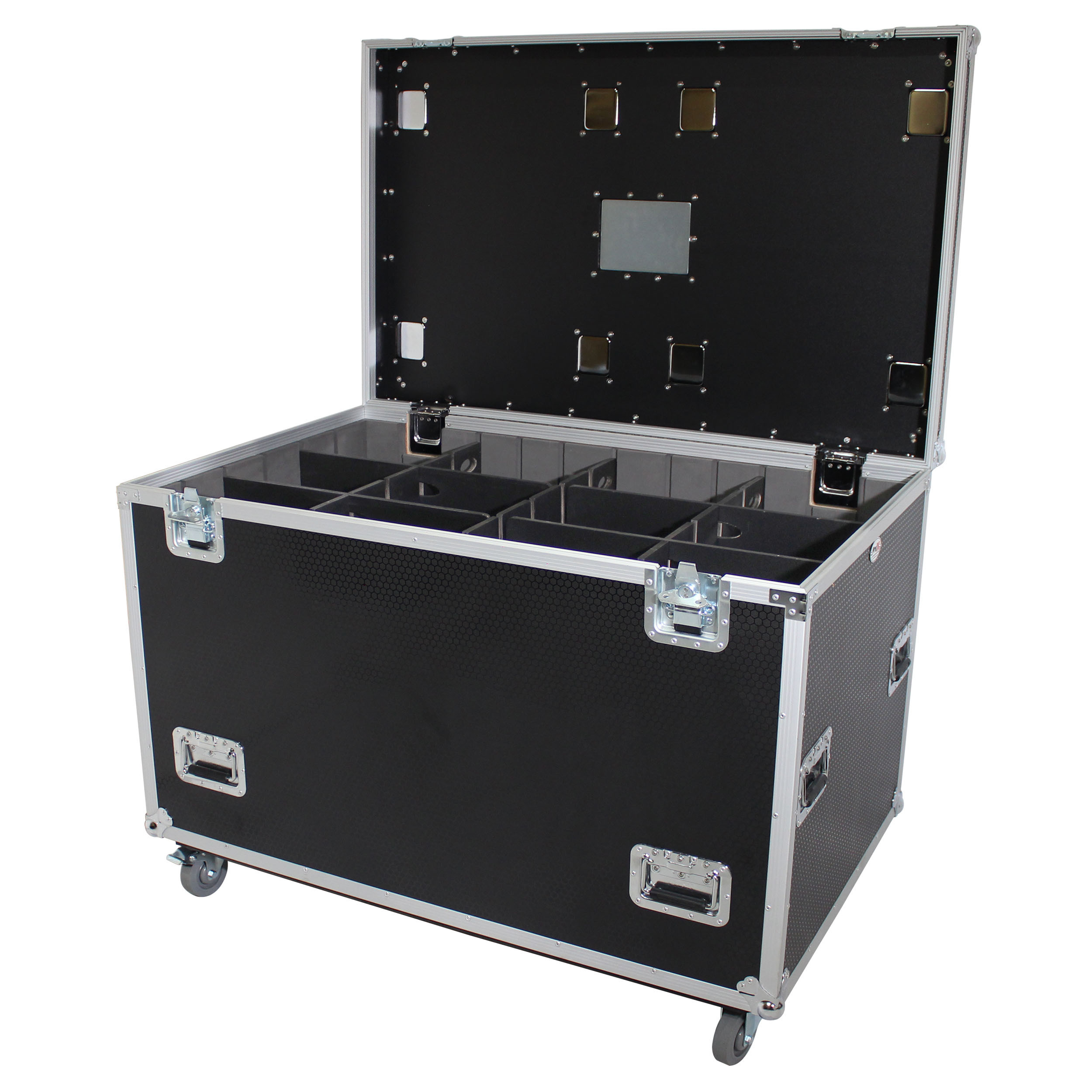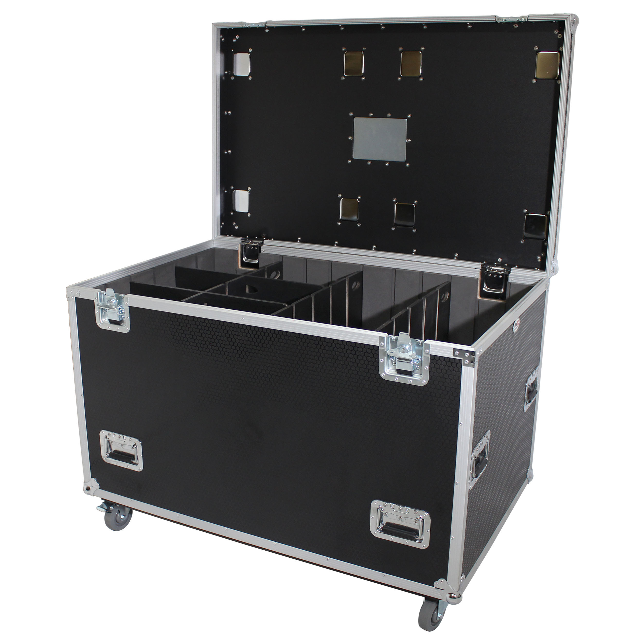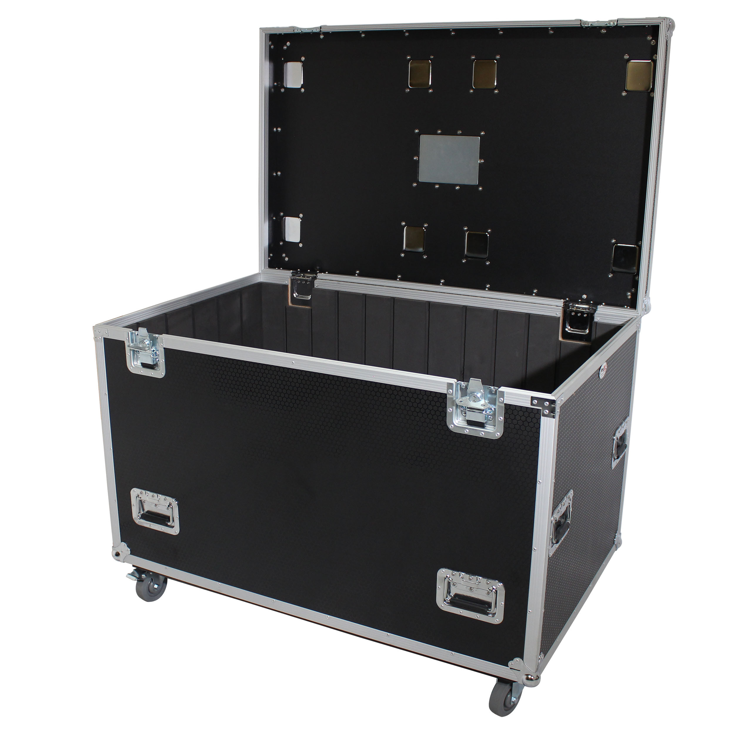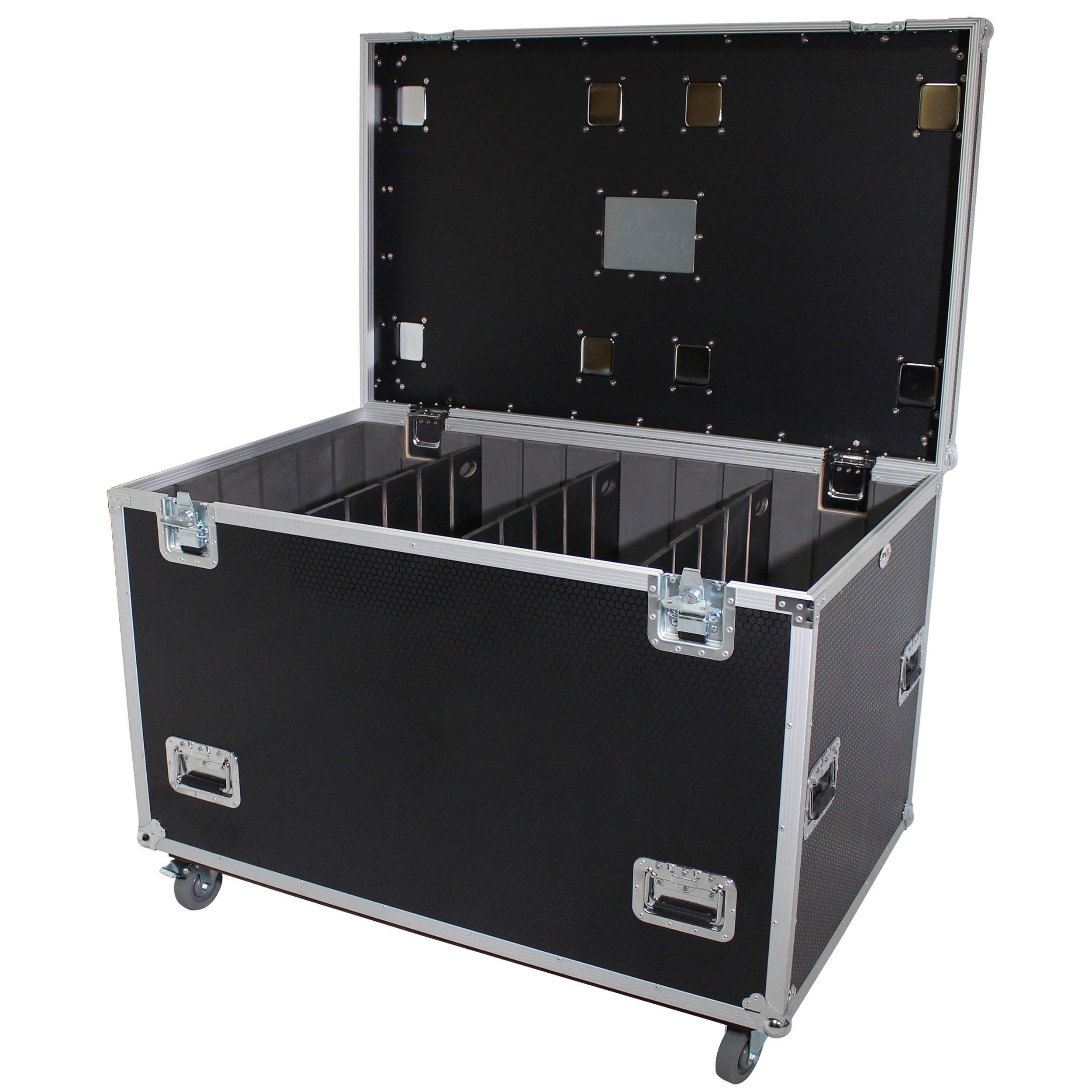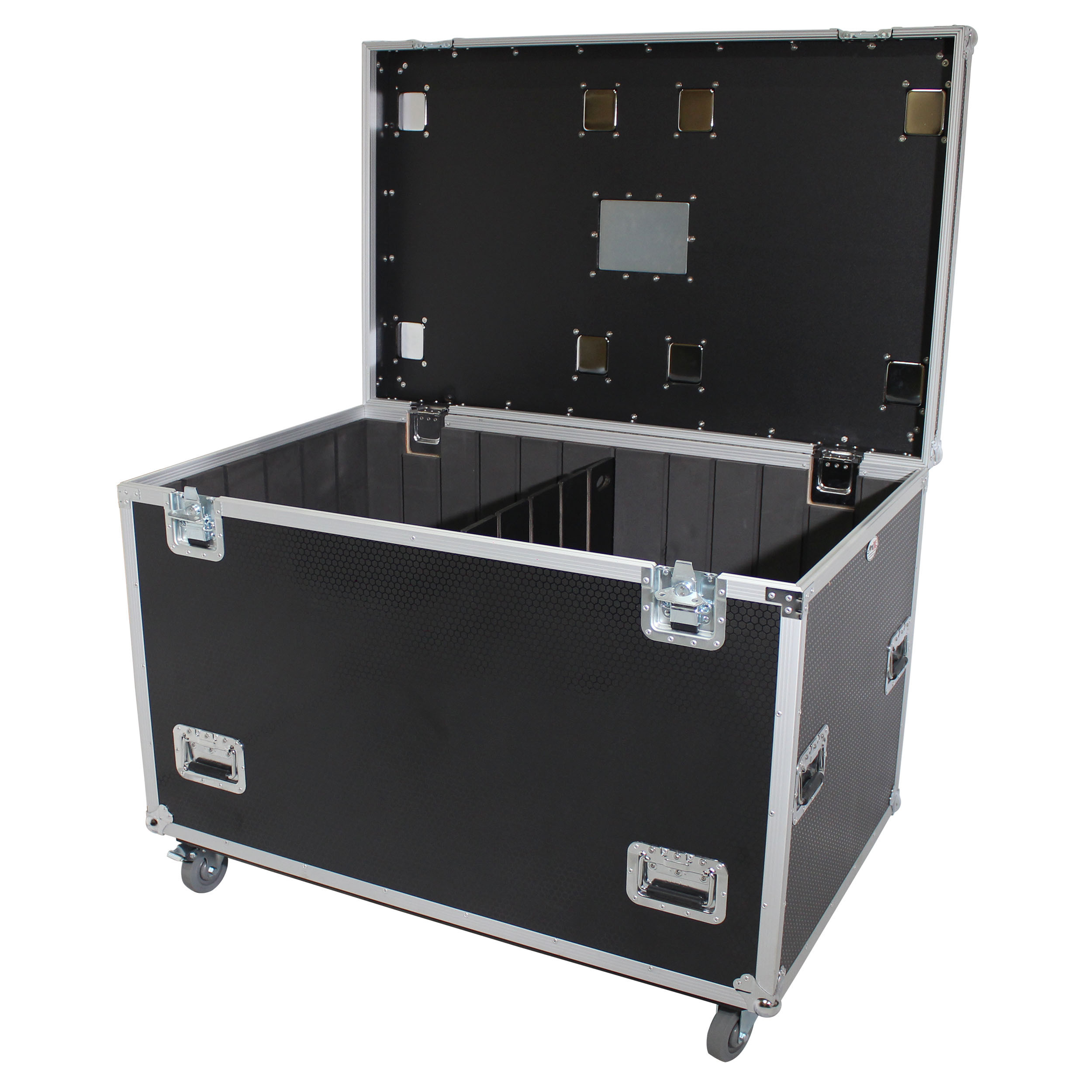 It is lightweight and has four durable 4" caster wheels, 2 of which are locking, which mount on the 3/4" Caster Board for durability and easy mobility with caster dishes on top for stacking and a recessed label insert. ProX TruckPaX' road cases stack perfectly like Lego's blocks. Pack end to end across shipping-containers and 90" box-trucks or side by side in semi-trailers and 96" box-trucks for the utmost in utility. Stack 3 high in High-Cube Trucks/Trailers. The case is equipped with Hold-Open lid hinges for convenience and safety. The removable tray and dividers provide more storage solutions.