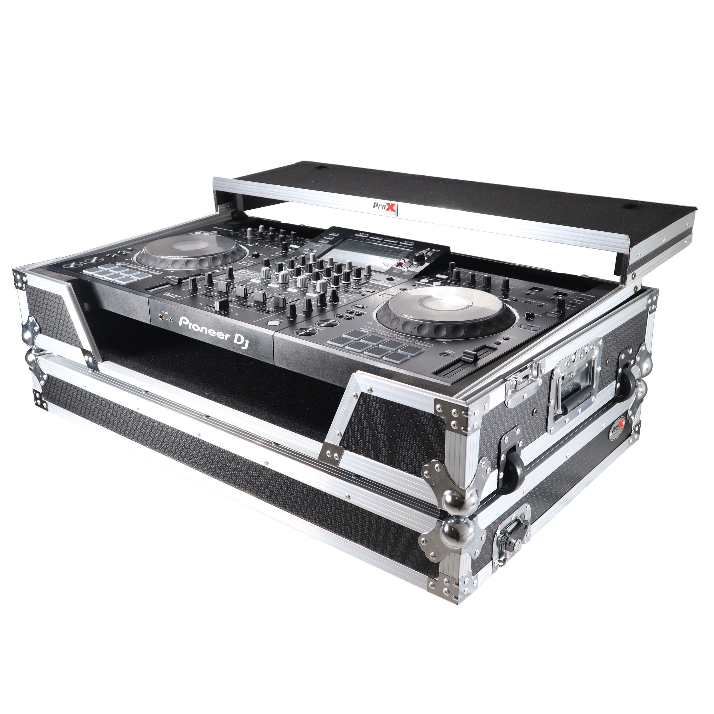 The ProX XS-XDJXZ WLT Case provides excellent protection for the Pioneer XDJ-XZ and ease of use for you. The fact that the XDJ will work with Serato and Rekordbox on a laptop is great, so we added a sliding laptop shelf for easy use! There is additional space for cables and small accessories in the back and underneath the unit for convenience, and a removable front panel to access front input jacks easily and access the front 1U rack space.
