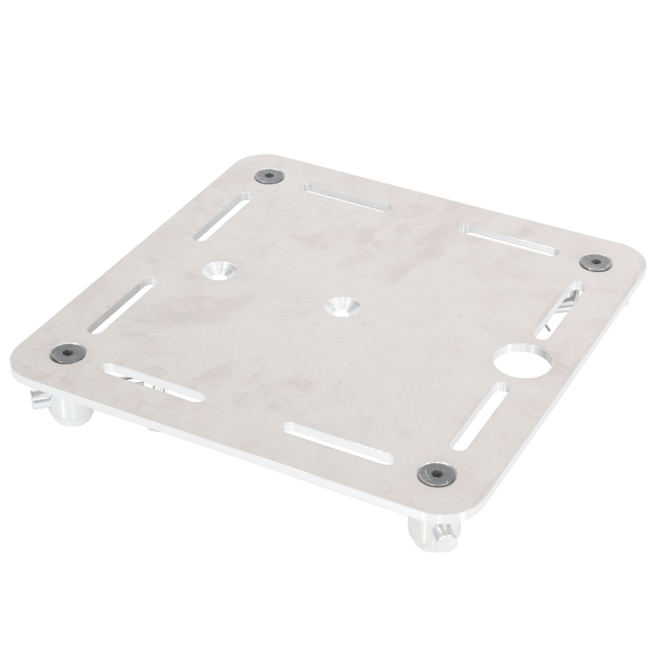 The plate comes with slots near the edges and a center hole and an offset hole for mounting to fit virtually any light/speaker or device that you want to mount, it also has a handy finger hold for easy carrying. It comes with all the necessary hardware to mount to the trussing. (Speaker Spud not included, available separately as XT-SPST.)