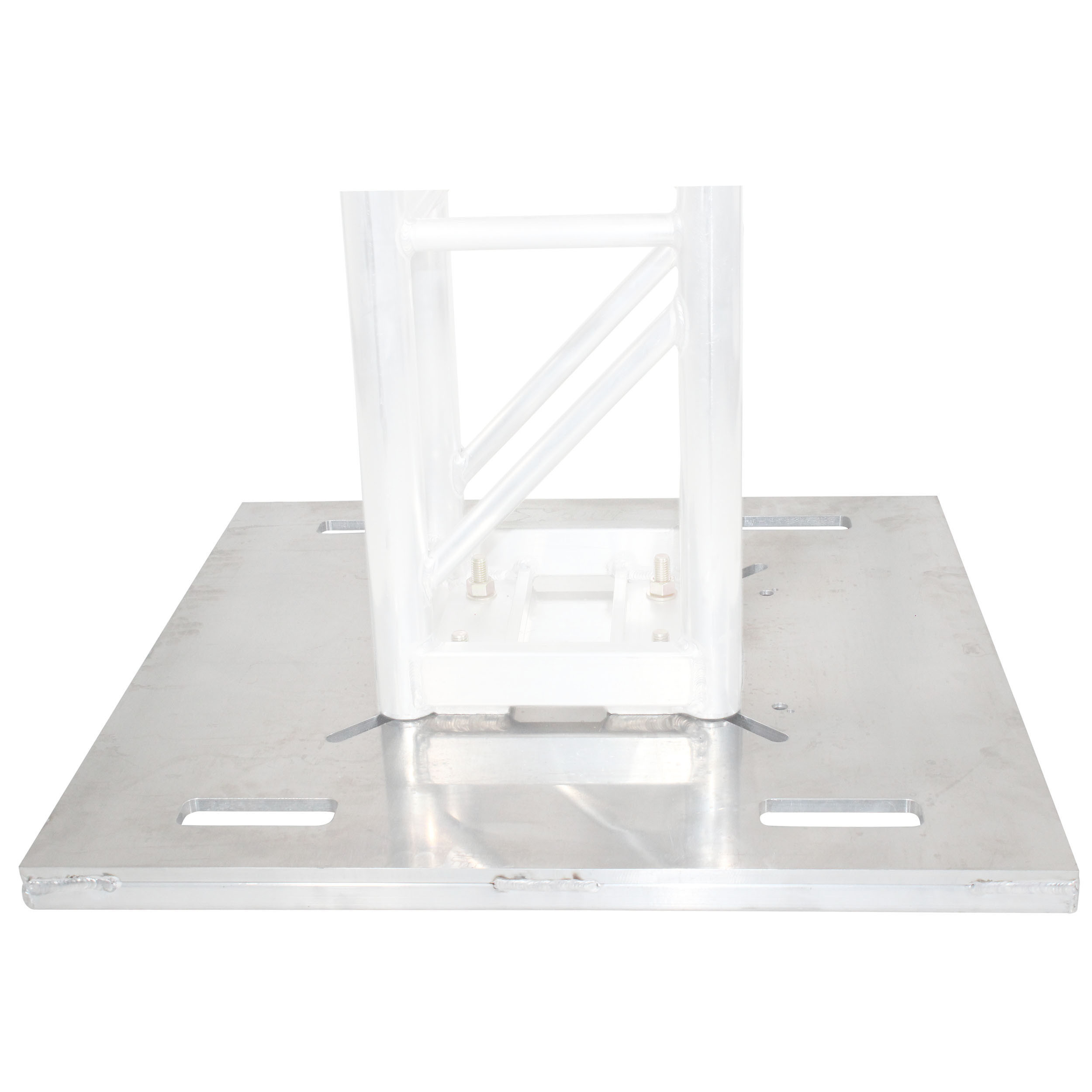 Compatible with most other 12" Professional Box Truss Manufacturers utilizing a 6.75" bolt center pattern. Each base plate includes one set of Four 5/8" - 11 x 2.5" (NC) attachment bolts, nuts, flat & lock washers.
