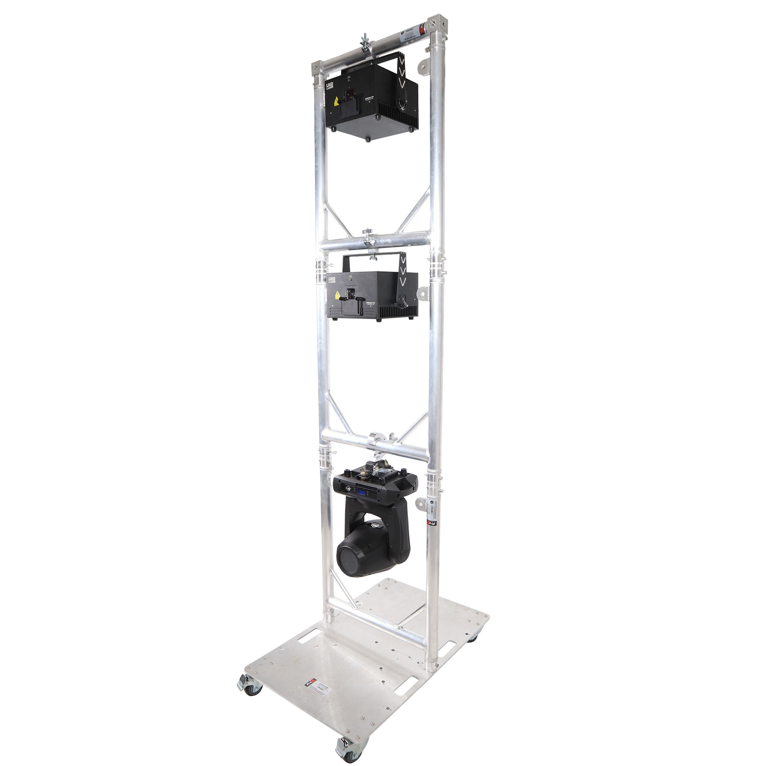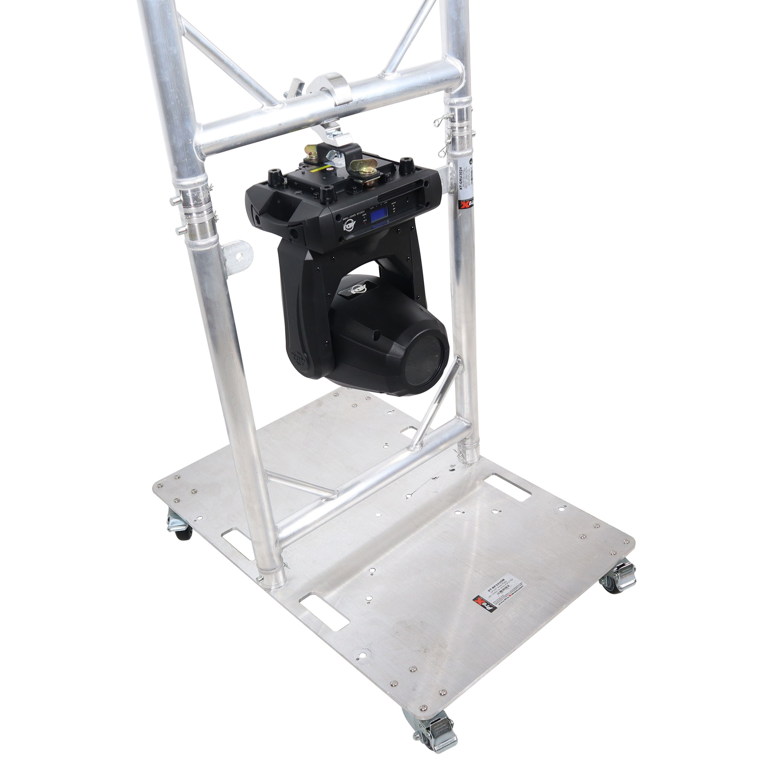 The XT-GRU3024 grid units allow for grid configurations tailored to your needs. You can hang up to10 grids beneath each other for custom layouts. The hanging frames are built from durable EN-AWT6 6082 aluminum frames and each grid will fit small to medium-sized moving-head lights. The rolling baseplate is constructed from 10mm AWT6 6082 Aluminum Plate with handle cutouts and multiple drilled stud mounting holes for versatility. The baseplate is designed to work with the XT-GRU3024 grid units but can also be configured to work with F34 trussing products as well. The baseplate casters allow for easy moving of the XT-GRU-PKGX3 from the truck to venue to stage with minimal effort and protection for your lighting devices.