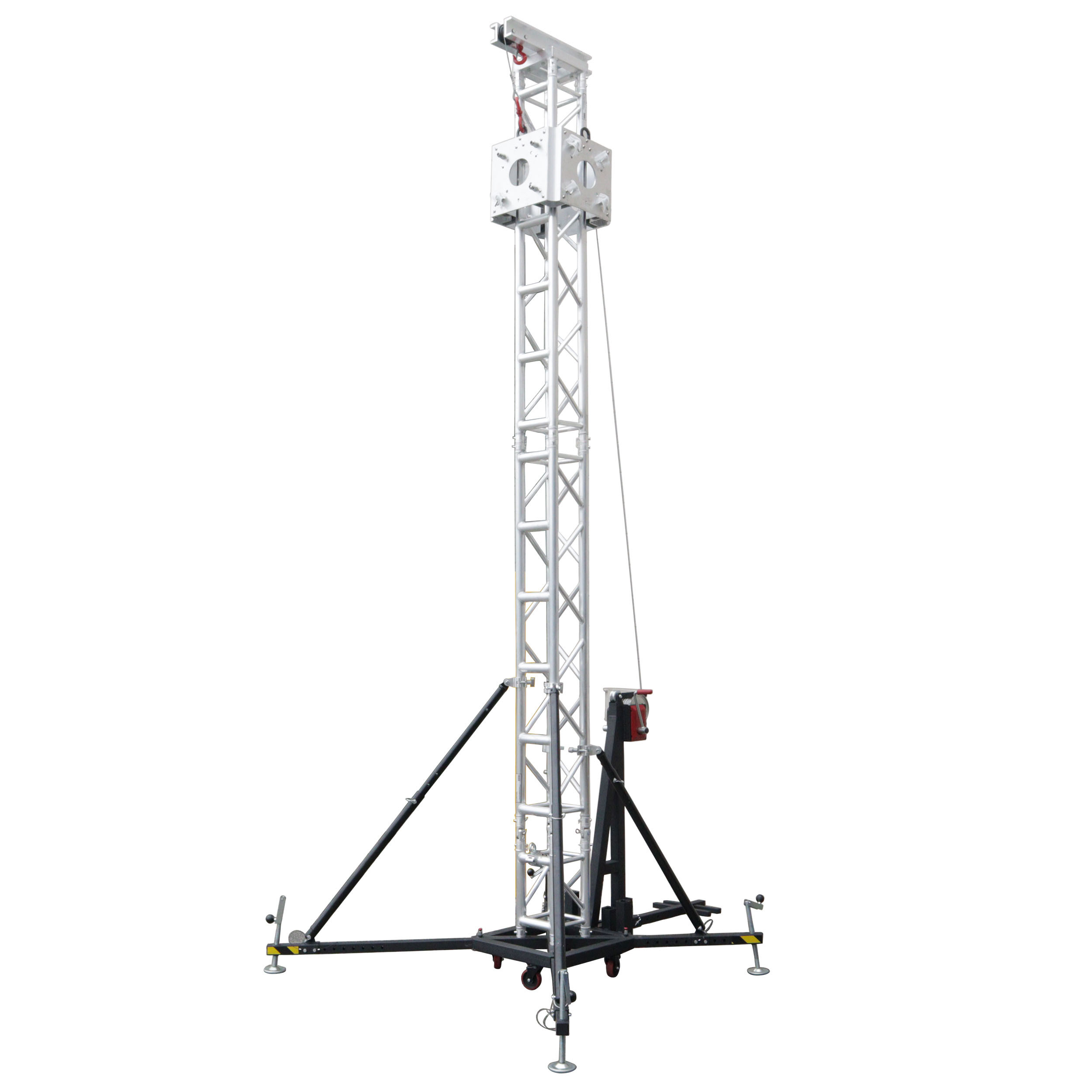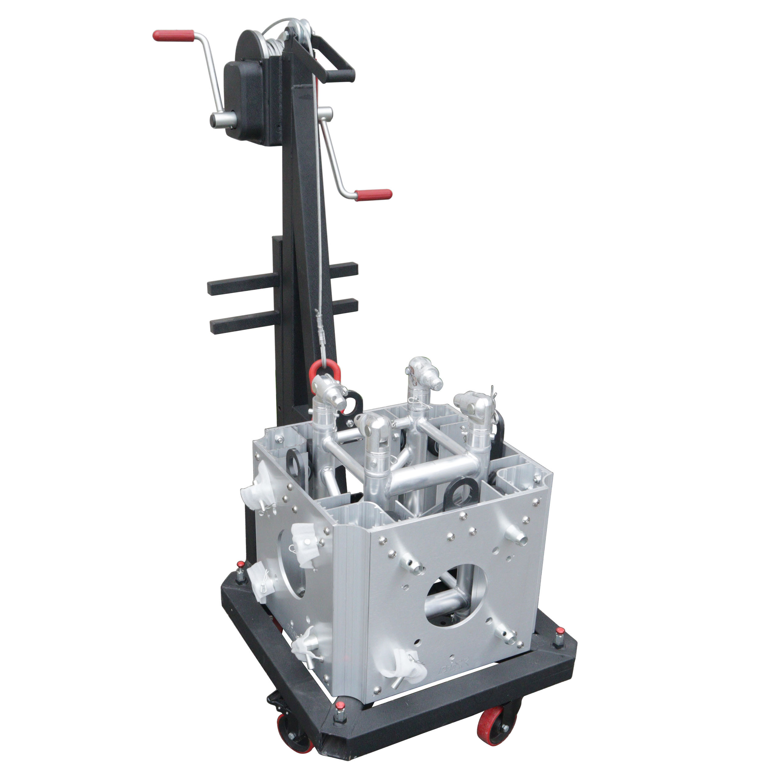 ProX XT-GSB WINCH PKG Ground Support LiftingWinch packagewithXT-GSOUTS3(FourOutriggerbraces)and XT-GSB MK2(Universal Ground Support on Wheels with Leveling Jacks)is a brand new system that allows a single person to lift andinstall truss towers by simplyrolling the winch system into the staging area,the lifting crank allows the tower to be liftedhorizontally with ease.Aluminum ground support towerwith double handlewinch.