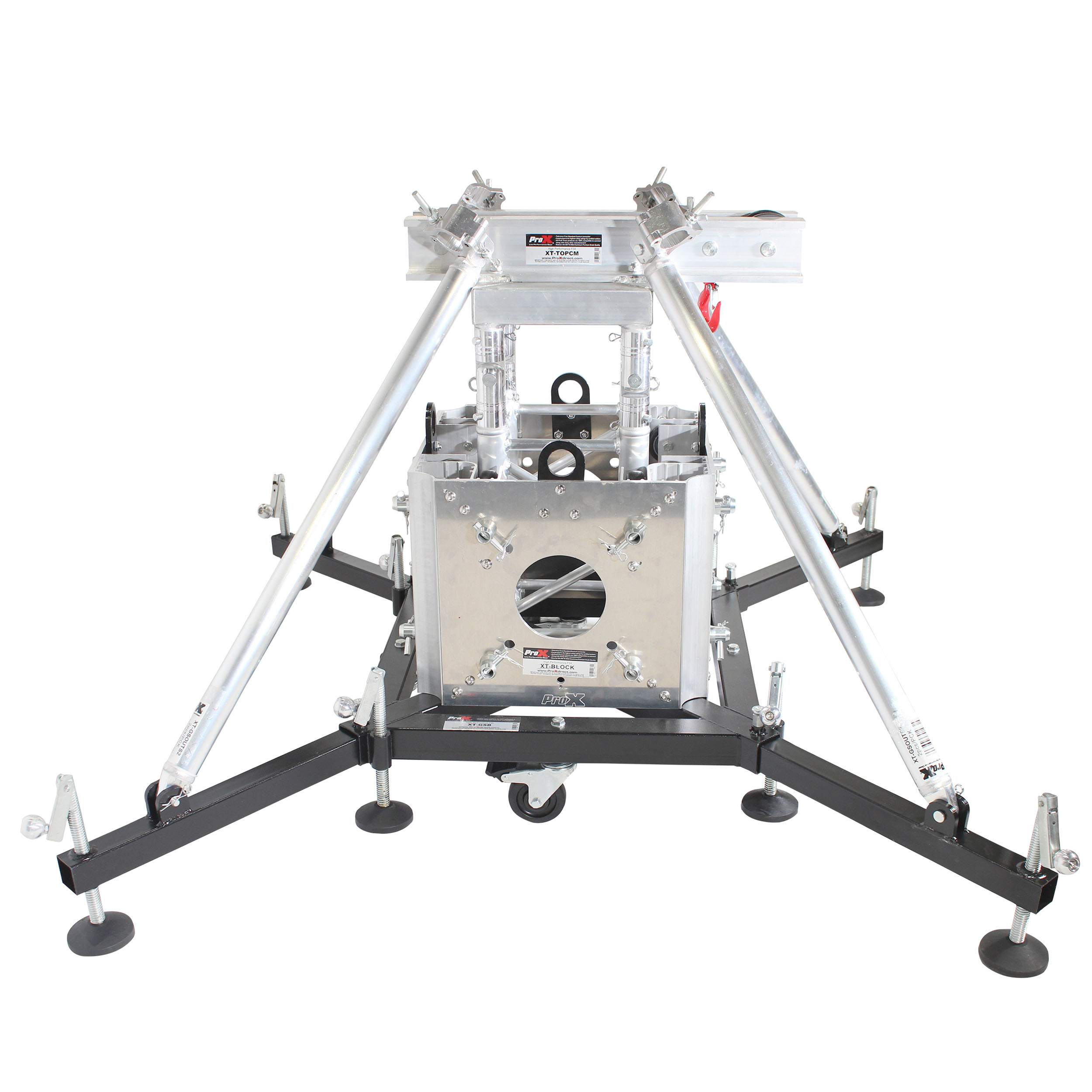 The ProX XTP-GSBPACK164is a Full Package of four-legged outrigger Truss base, with a 4-way Square Truss junction box Sleeve Block, on a 1.64' long square Truss. Complete with the Rigging Top.