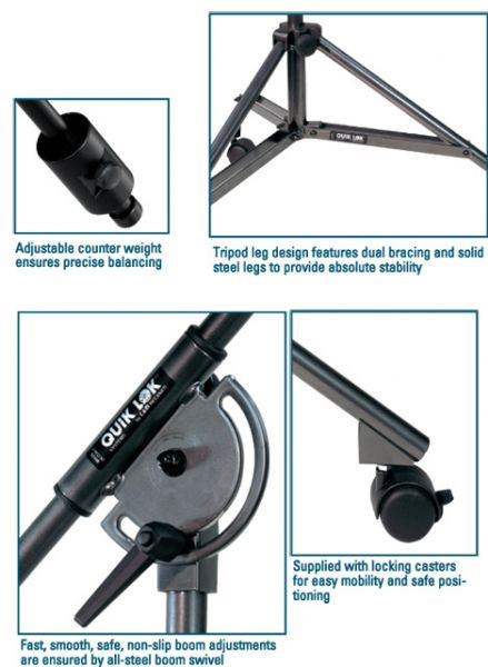Perfect stand for any recording, broadcast or live show application. Tripod leg design - using SOLID STEEL LEGS not tubing - provides stable base for use with all kinds of studio mics. Easy-roll locking casters secure the stand firmly in place. Supplied with convenient mic cable clips. Available in scratch-resistant, baked-on, non-reflective black enamel finish.