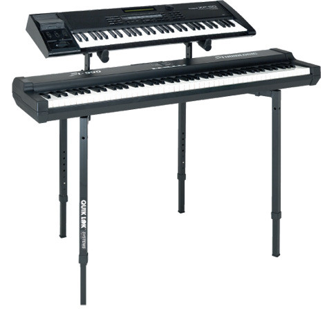 Designed to hold consoles or heavy speaker cabinets up to 300 lbs. total weight and from 30" to 60" wide. 8 different height adjustment positions. Folds down to a convenient "T" for easy transport.