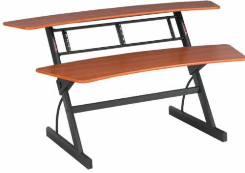 Dual level project desk system w/ 8-space rack holders and contoured cherry wood tops.