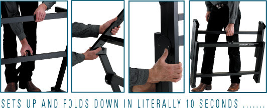 Quik Lok, the originator of the all-steel "Zeenith" stand, proudly introduces the new Z/71ALU ULTRALIGHT foldable "Z" structure, patent-pending design that sets up and folds down in literally 10 seconds flat! Height adjustment is a snap because of a spring-loaded, dual pin system that instantly releases and locks the tiers into the desired height position.