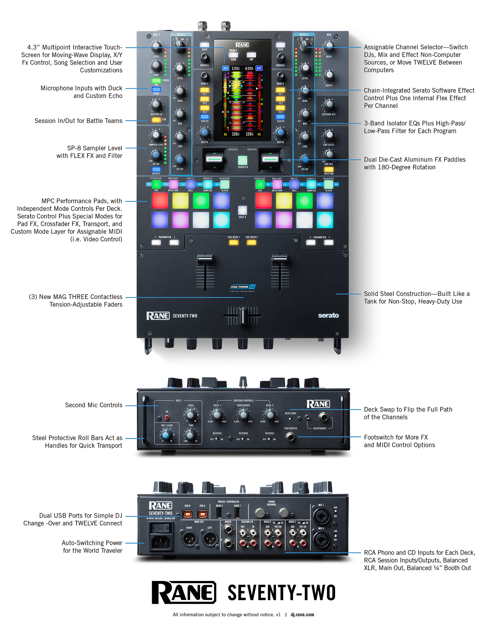 With the RANE SEVENTY-TWO, two DJs can battle it out with their laptops simultaneously through the two USB computer connections. With a brand-new 4.3-inch color touchscreen, the SEVENTY-TWO not only shows Serato's moving waveforms and their cue points, it also brings a much-needed interactive experience to FX work flows, with two internal FLEX FX engines and stacked Serato effects. Die-cast aluminum toggles and customizable MPC pads unleash the creativity that all battle DJs have in them.