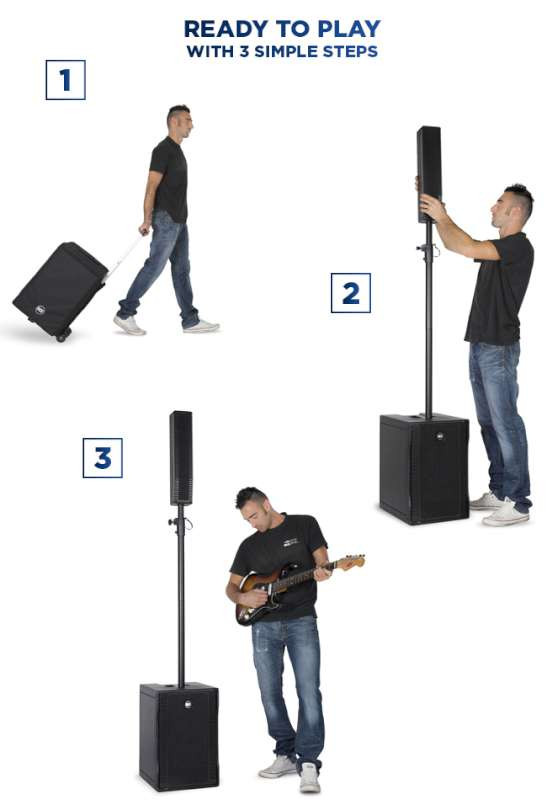 PORTABILITY With 3 simple steps, the EVOX system is all set and ready to play! EVOX system is designed to be easily transported and quick to set up. Top, Sub, pole mount and cables all come in one package and all go in the dedicated optional transportation bag.