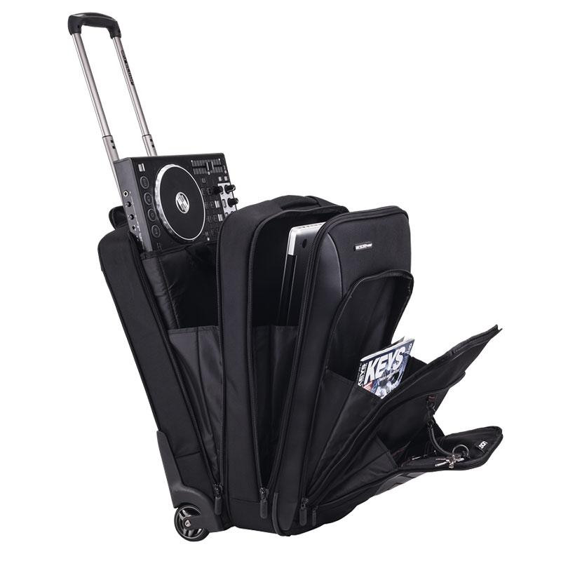 THE CONTROLLER TROLLEY FOR THE PRO DJ.Stylish and made of extremely resistant and water-repellent materials, the trolley offers smooth-running inline wheels and a full aluminium bar with extricable telescope handle.