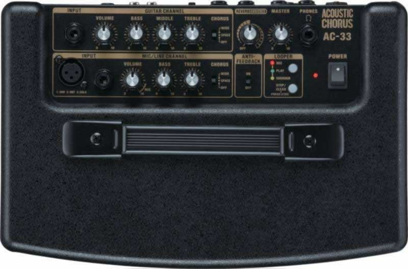 Natural, Stereo SoundEquipped with Roland's latest DSP technology, the AC-33, delivers pure, rich acoustic sound with projection far beyond its size. Its true stereo design (15 watts x 2) enables brilliant stereo/multi-band chorus with "Wide" mode, plus shimmering reverb and 3D-type ambience effects tailored specifically for acoustic guitar.