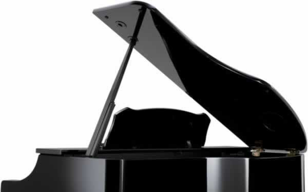 •Beautiful polished ebony mini-grand piano cabinet; the fallboard reflects the performer's hands