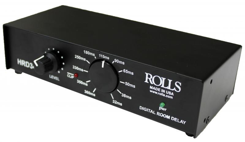 The Rolls HRD342 is intended for low cost, simple, time alignment of speakers in larger rooms or outdoors. The delay dial is shown in mili seconds to make setup easy. The 32 to 360 ms shown on the dial will correlate to about the same in feet (32 ms = 32 ft). The Rolls HRD342 is inserted between the main console output and the amplifiers supplying the delayed speaker signal.