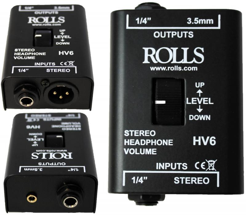 The Rolls HV6 Stereo Headphone Volume Control may be inserted at any point in your headphone signal path allowing you to adjust your stereo headphone level. It does not require power to operate. The device accepts 1/4" TRS or balanced stereo XLR as inputs, and outputs a stereo signal to 1/4" or 1/8" phone jacks. A wheel in the center of the unit allows you to adjust the level up or down.