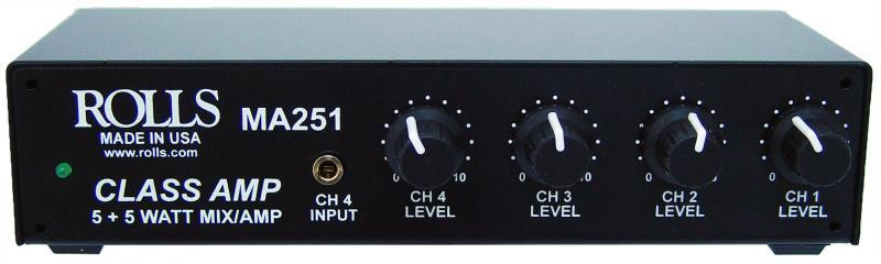 The new MA251 is a compact class D stereo amplifier with a 4 CH. stereo mixer built in. It has 5 watts per channel @ 4 Ohms. The class D low heat design gives the MA251 the ability to be mounted in very tight applications. It will work great in ceilings by projectors, or anywhere small and heat free amplification is required.