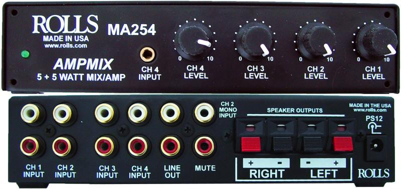 The Rolls MA254 Compact Mixer Amplifier is the perfect amplification and audio mixing source for small multi-media setups, projection audio, light sound reinforcement applications, etc. The MA254 is capable of 5W + 5W of output power, and features an integrated 4-channel mixer.
