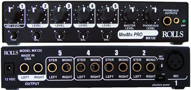 The MX122 is a five channel audio mixer which combines a single microphone signal with four stereo instrument or line level signals. The XLR Microphone input has a trim control and switchable +12 VDC phantom power available. The unit is ideal for musicians needing to mix stereo keyboards and sound modules with a single microphone.
