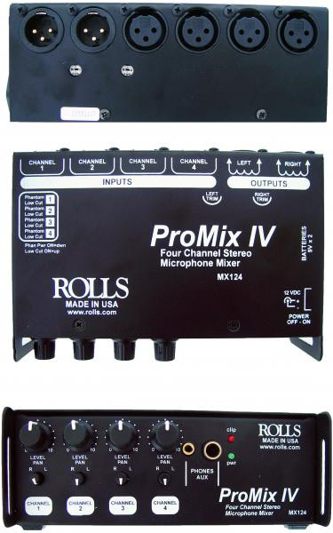 The MX5124 Pro-MixIV mixes 4 microphones into two transformer balanced outputs. It has three XLR inputs, each with individually switchable phantom power, and Low Cut switches, a Level control, and a Pan control. As mentioned, it has two transformer balanced, XLR outputs. A 1/4 inch Aux/Headphone output has been provided along with a Clip indicator, Power indicator, and Power switch. The unit is also powered by two 9-Volt alkaline batteries.