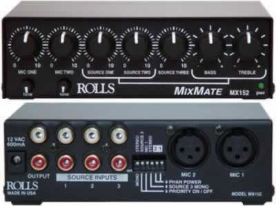 The MX152 is a one-half rack space, two microphone and three stereo source mixer. The unit provides a compact and efficient way to mix sources such as AM/FM tuners, CD players, and video players with dynamic or condenser microphones.