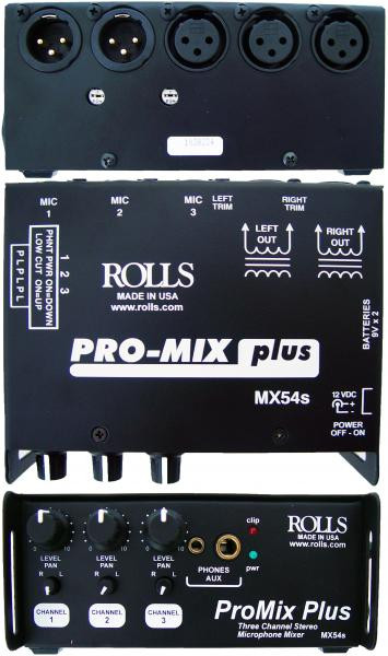The MX54s Pro-Mix Plus mixes three microphones into two transformer balanced outputs. It has three XLR inputs, each with individually switchable phantom power, and Low Cut switches, a Level control, and a Pan control. As mentioned, it has two transformer balanced, XLR outputs. A 1/4 inch Aux/Headphone output has been provided along with a Clip indicator, Power indicator, and Power switch. The unit is also powered by two 9-Volt alkaline batteries.