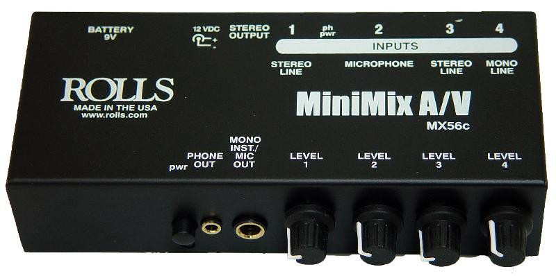 A variety of outputs have also been included on the MX56c. In addition to rear panel stereo RCA outputs, the MX56c offers a front panel stereo 1/8" (3.5mm) headphone/earphone output, and a 1/4" Tip-Ring-Sleeve balanced mic out. A power switch is located on the front panel, and the unit operates on a 9V alkaline battery or the included Rolls PS27 12VDC adapter. This unit is ideal for the audio/video application where a microphone needs to be mixed with a stereo source such as a CD/MP3/DVD player, or wireless microphone to a video camera or sound system for presentations.