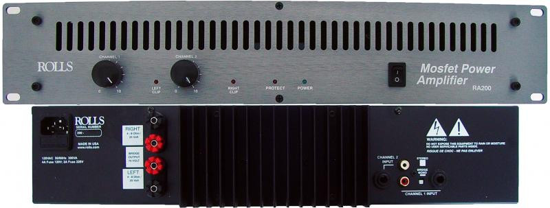 The RA200 features two 100 watt RMS - 4 ohm outputs, a bridging switch, MOSFET drivers in a voltage and current gain circuit, one second power-up delay, and LED power output meters. The unit is housed in a painted steel chassis and includes a special high performance transformer, and a fused power line. The MOSFET output stage is fault protected which allows the RA200 to forgive momentary output shorts, and has over-temperature protection.