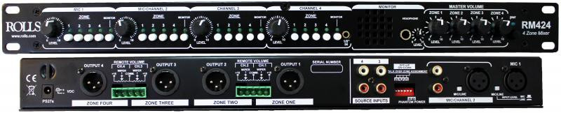 The new ROLLS RM424 Four Zone Mixer combines two paging microphones with two line level source inputs. Each input is switch selected to output to any combination of four zone outputs. The outputs are all balanced XLR connectors, Remote Volume provides each zone with the means for external volume control.