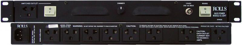 The Rolls RPM26 is a single rack space, power distribution unit supplying 9 total switched AC power outlets. Eight outlets are located on the rear panel, two of which are spaced widely so as to accommodate "wall-wart" type power adapters. A single outlet on the front panel has its own separate power switch.