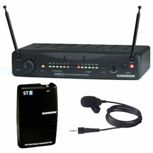 The SR55 receiver makes true diversity wireless technology available to everyone. Features variable squelch, six segment LED RF level and audio level metering, dual front mounted antennas and XLR and 1/4" outputs.The ST5 belt pack features 1/8" mini-jack input for all Stage Series mic transmitters. Will operate flawlessly for 10 hours with one 9 Volt Battery. Includes battery level meter. Includes:- ST5 Beltpack- LM5 Lavalier Mic- SR55 Receiver- AC Power Supply- Carry Case