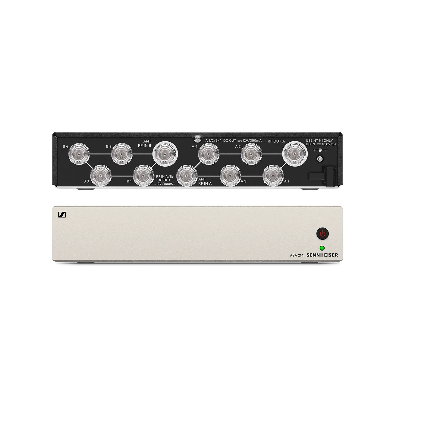 The ASA 214 active antenna splitter is built in a full metal housing and ships with 8 BNC cables included. The splitter runs up to 4 receivers of the ew series with one antenna. The UHF-Version includes the NT 1-1 power supply with EU, UK and US adapters, while the ASA 214-1G8 includes the NT 1-1 with EU, UK and AU adapters.