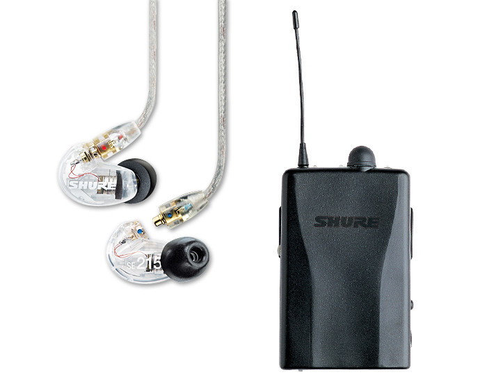 Includes P2R hybrid bodypack receiver, SE215-CL Sound Isolating Earphones, 9V battery, cable, zipper bag, and user guide.