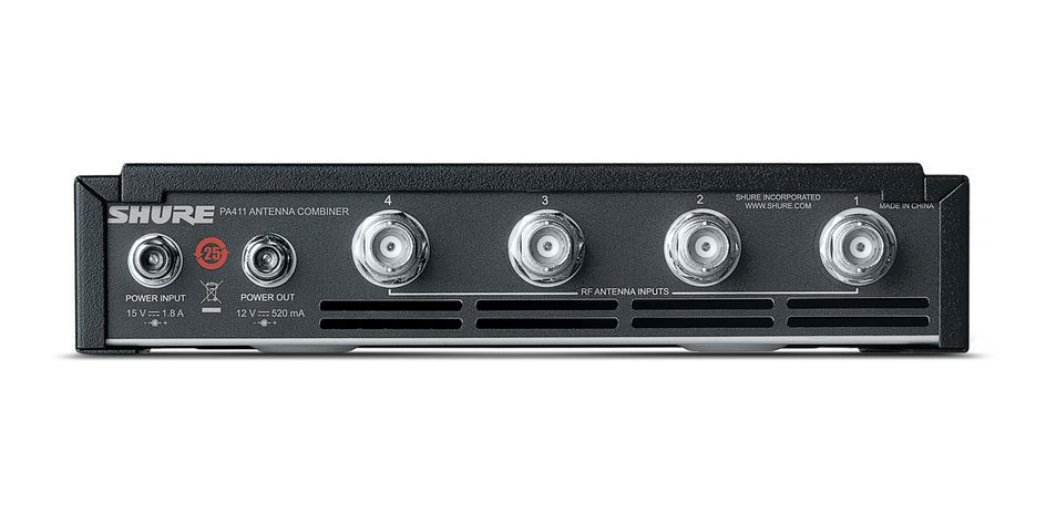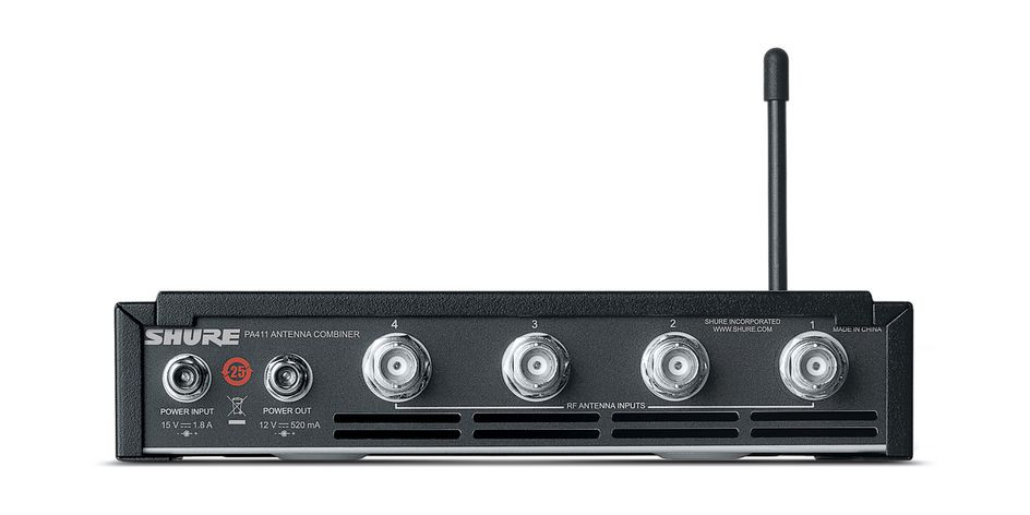 The Shure PA411 Antenna Combiner distributes DC power and RF signal while reducing rack clutter for up to four PSM300 systems.