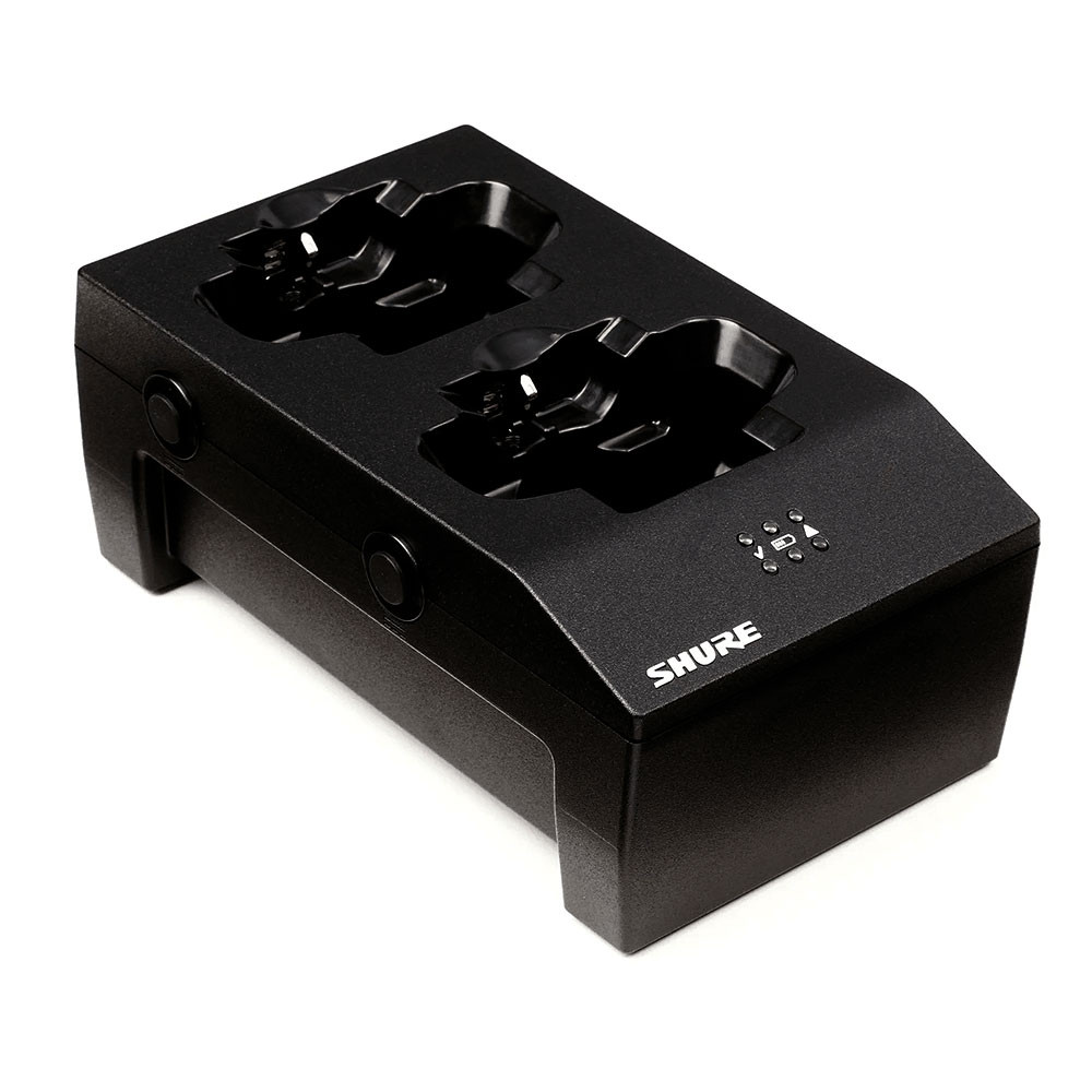 Dual-docking Shure battery charger. Power supply NOT included. Requires a PS60US power supply, or can be daisy-chained to a SBC200US unit. Works with SB900A, UR5*, P3RA, P9RA, P10R, AD1, AD2, QLX-D Digital Wireless Systems and ULX-D Digital Wireless Systems.