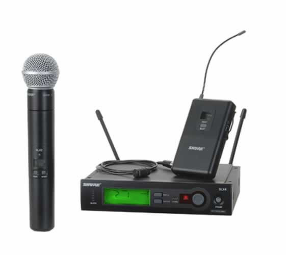 SLX Wireless Handheld/Lavalier Combo System, Includes SLX2/58 Handheld Transmitter with SM58 Microphone, WL185 Cardioid Lavalier Microphone, SLX1 Bodypack Transmitter, and SLX4 Diversity Receiver.