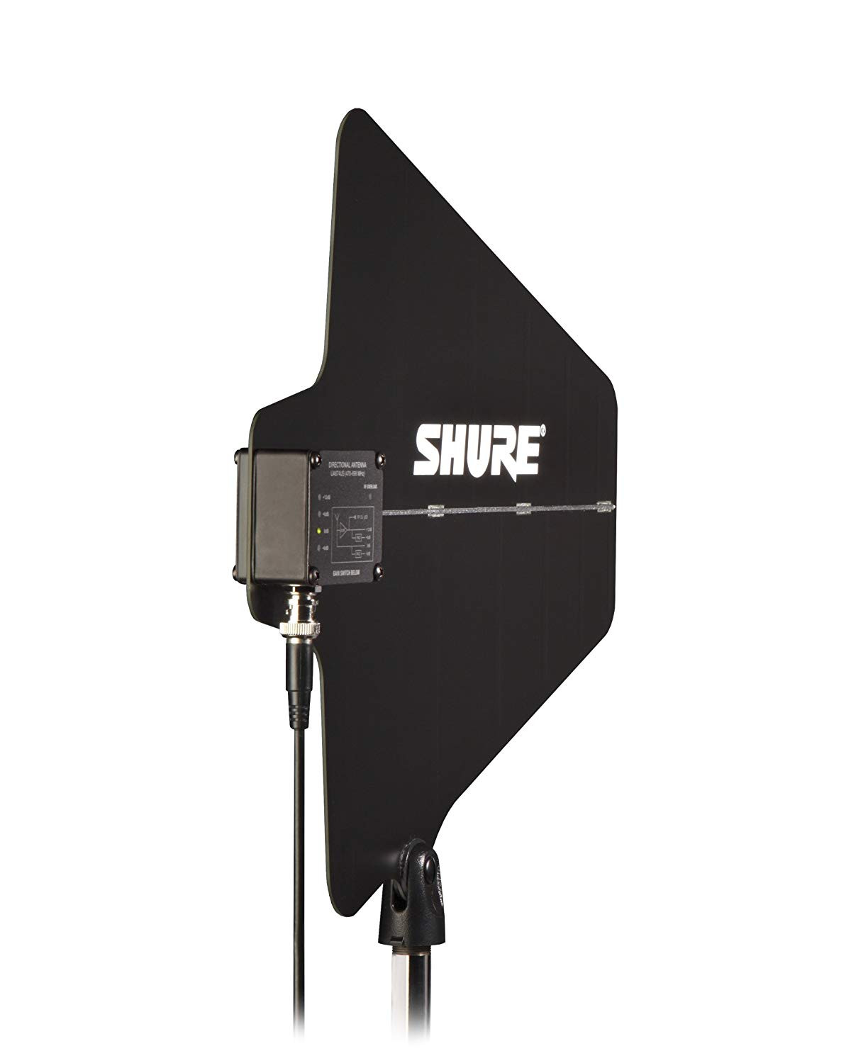 Active directional UHF antenna with integrated amplifier for improved wireless signal reception. Experience improved wireless reception with the UA874. This UHF antenna uses a log periodic dipole array to produce a cardioid pattern toward the desired coverage area, achieving greater rejection of RF signals outside the area than standard wave omnidirectional antennas.