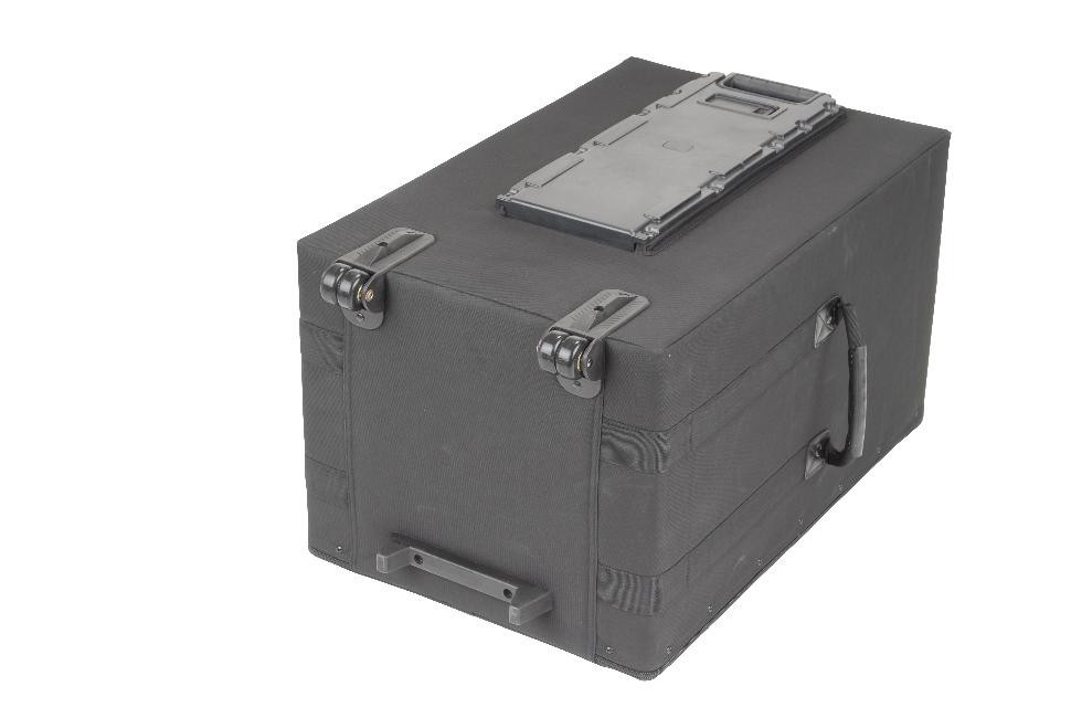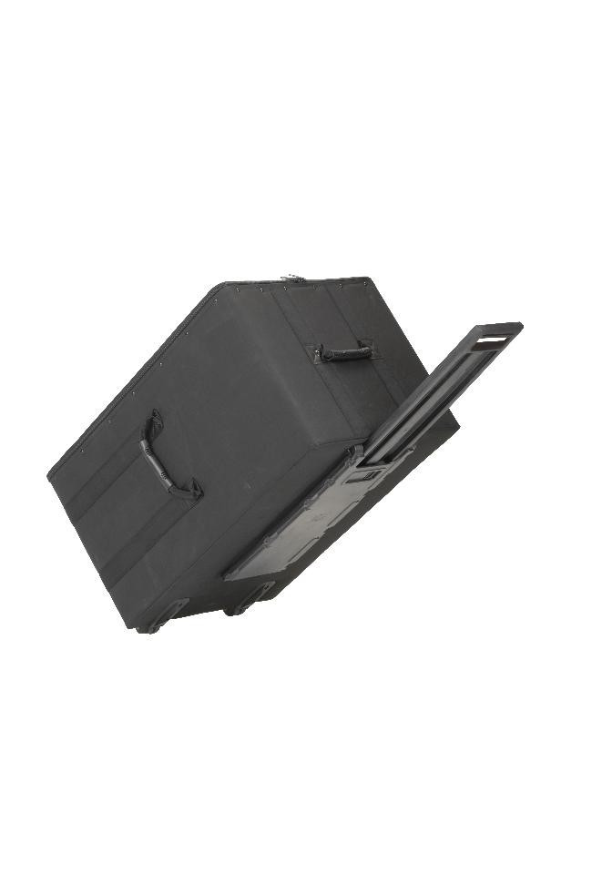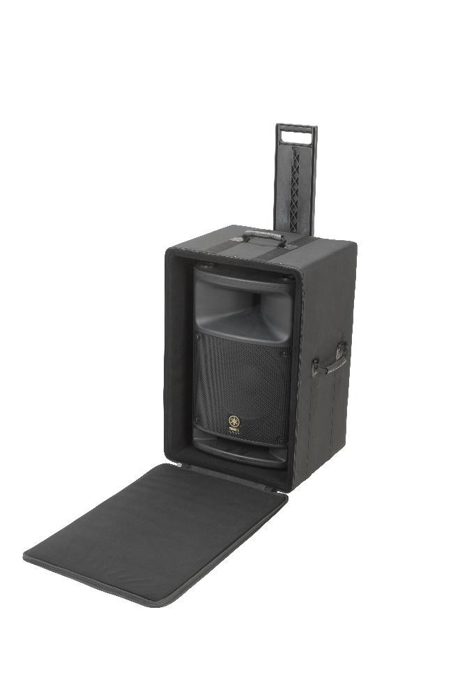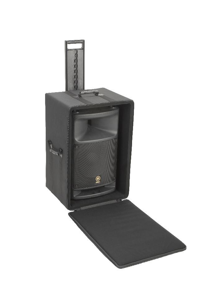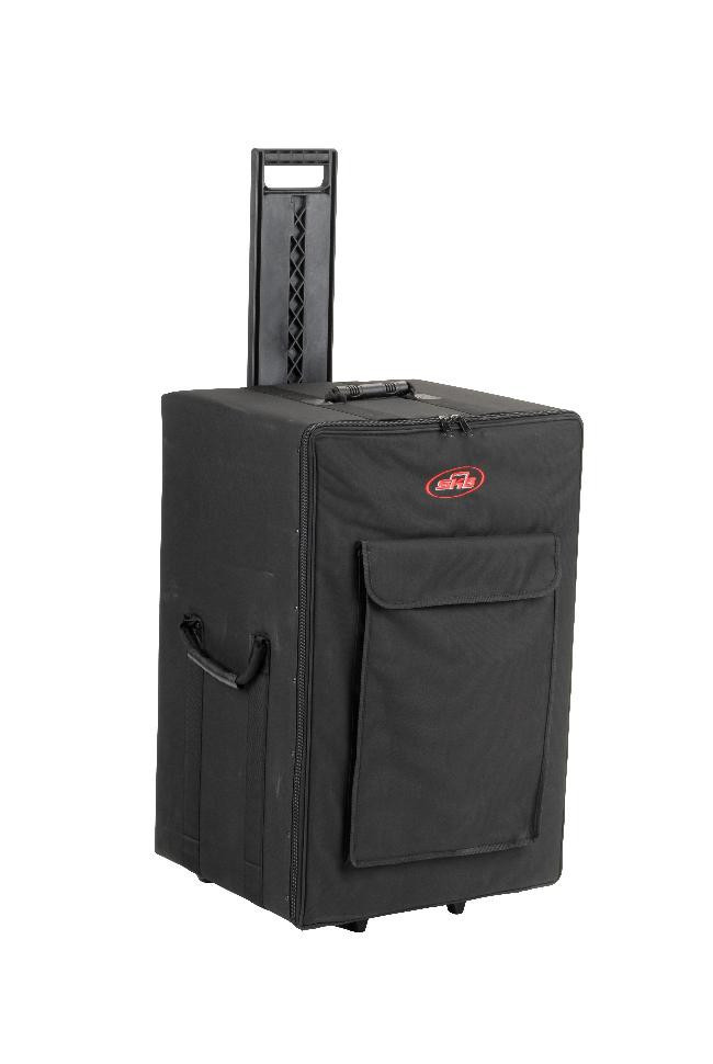 An indestructible injection molded pull out handle and dual wheels for easy transport. The SKB-SCPS1 Speaker Soft Case will accommodate powered speakers such as the JBL EON 515, Mackie SRM450 and many others.
