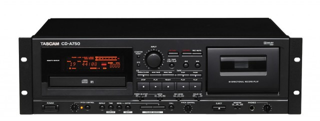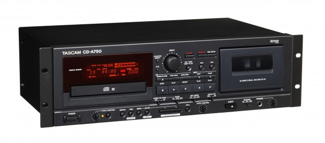 The CD-A750 is a combination CD player and cassette recorder with unbalanced phono inputs and outputs, balanced XLR ins and outs, parallel and RS-232 control. It has contractor-specific features such as power-on play, a wired remote control, rackmountable design and shock memory on CD playback.